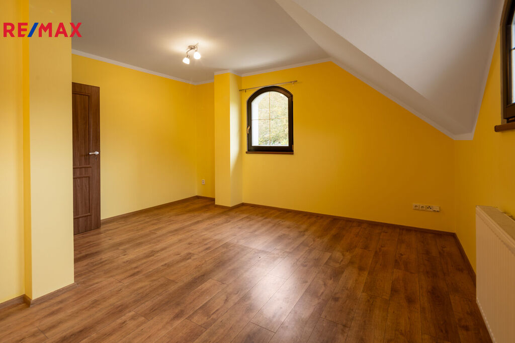 V prvním patře jsou tři další pokoje. Hlavní ložnice disponuje vlastní koupelnou a balkónem, který nabízí nádherný výhled na okolní krajinu. Pro pohodlí celé rodiny je zde navíc druhá koupelna.