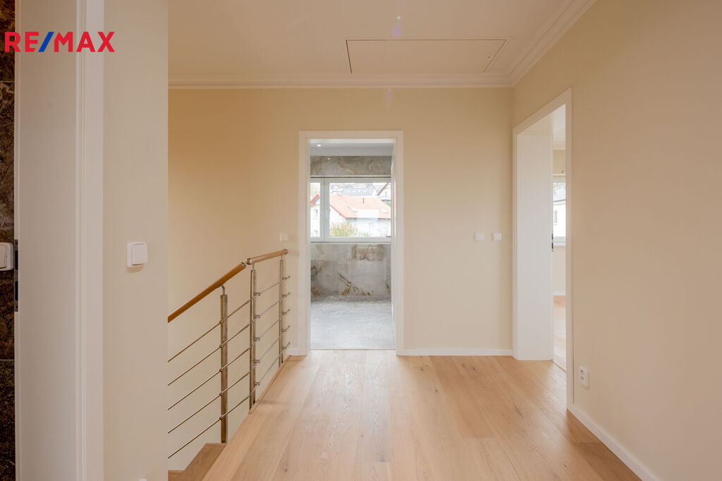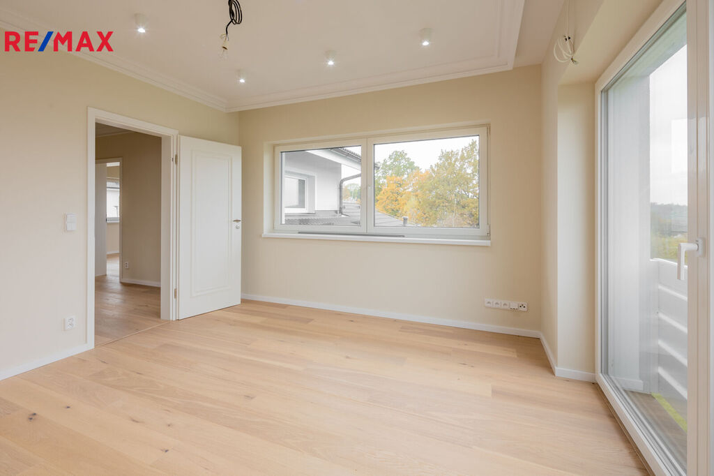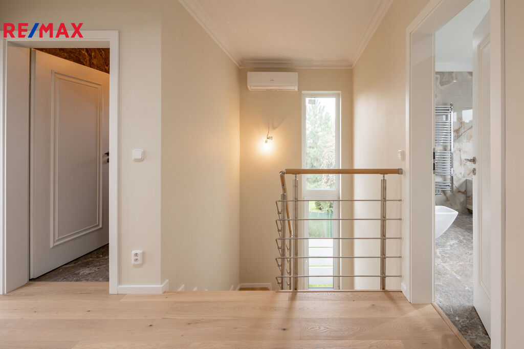 Schodiště vás zavede do horního patra, kde na vás čekají dvě světlé ložnice. Zdejší koupelna s vanou a toaletou nabízí dostatek pohodlí i pro větší rodinu.