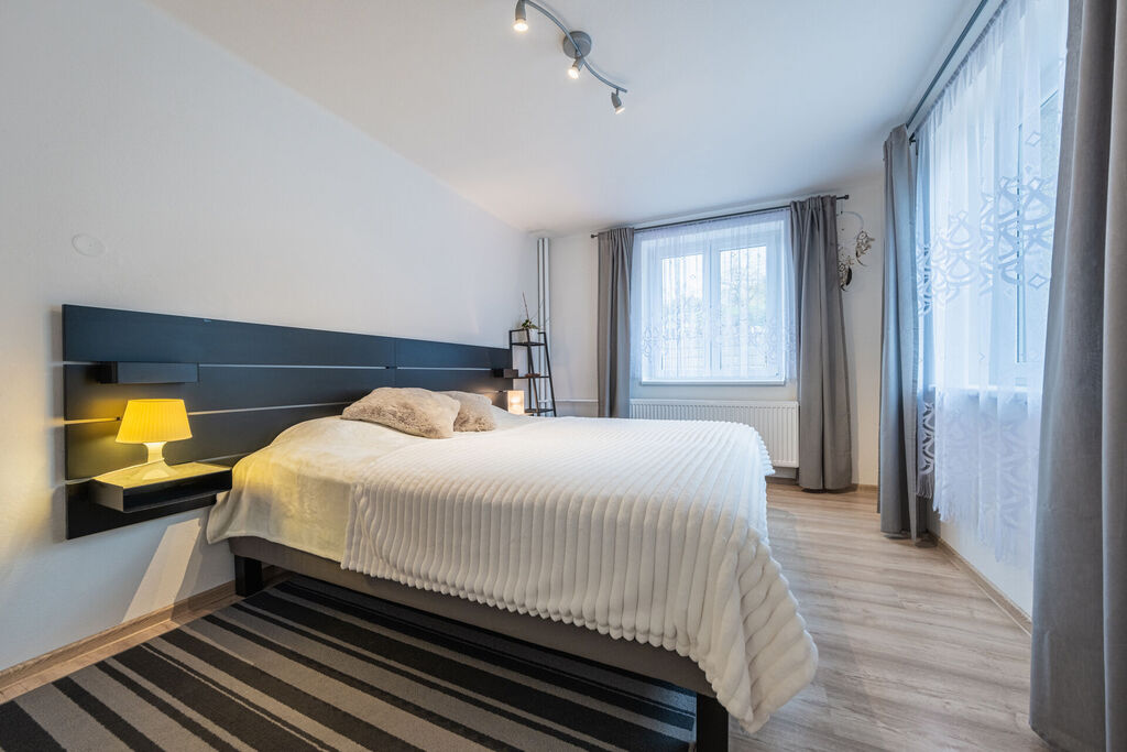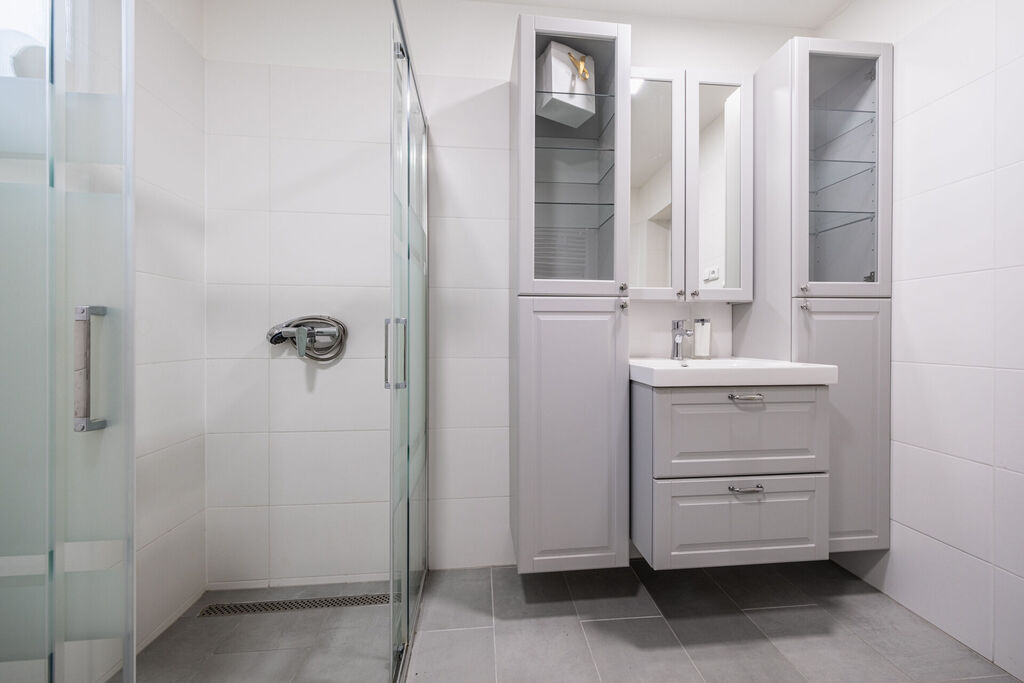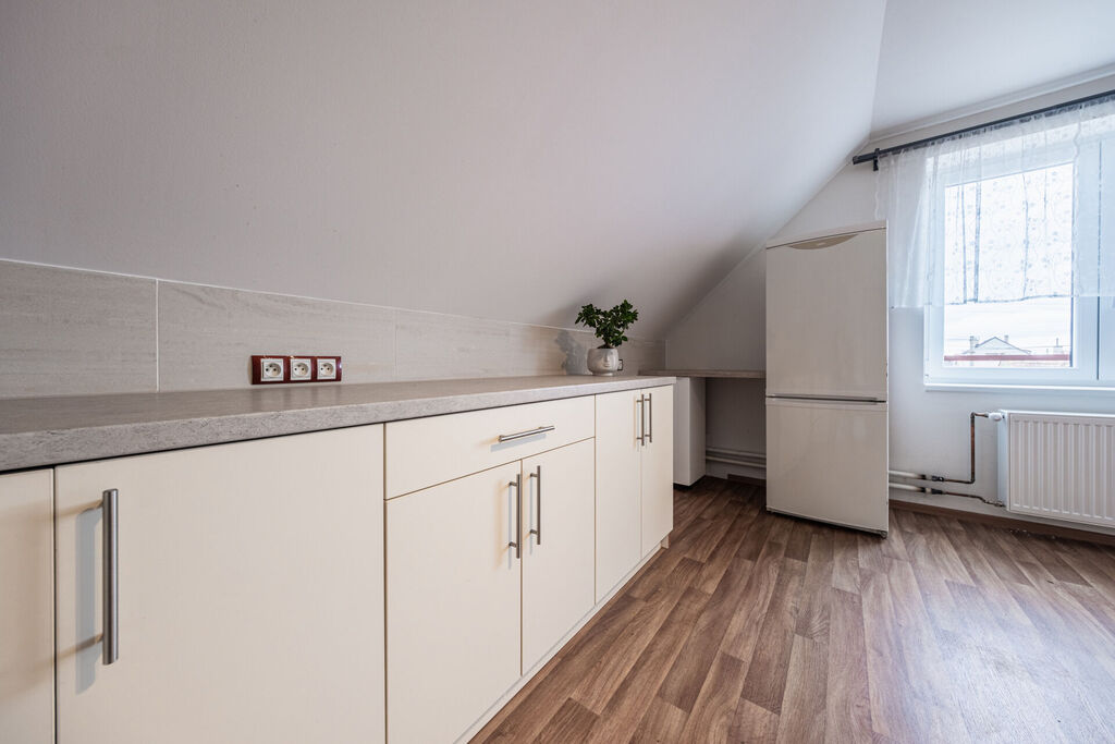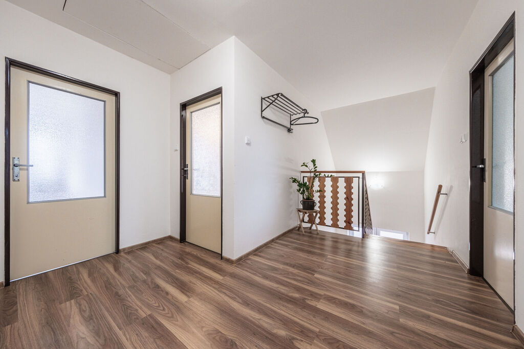 V patře je pak prostorná centrální chodba a vstup do dalších třech velkých obytných místností, druhé koupelny se sprchovým koutem a samostatné wc. Nahoře se pak nachází ještě druhá prostorná kuchyň, díky níž je možné dům udělat na dvougenerační nebo využít pro rodinné návštěvy.