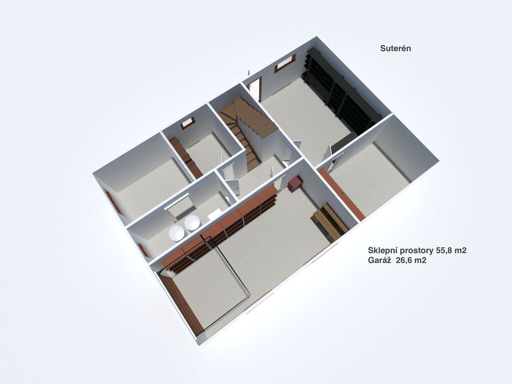 V podsklepení je prostorá garáž a čtyři suché místnosti.