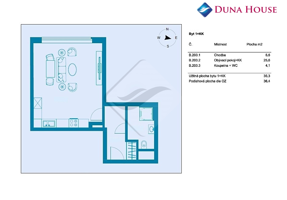 Byt 1+kk, 36,4 m2 velký, sestávající ze vstupní předsíně, koupelny s toaletou a prostorného pokoje s kuchyňským koutem, je situovaný ve 3. NP nového viladomu.