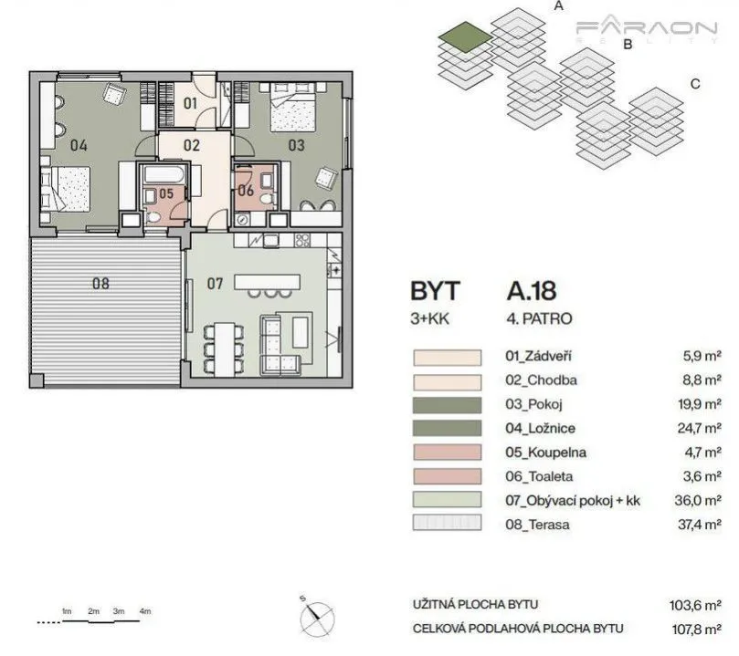 Nadstandardně prostorný byt 3+KK o ploše 108,7 m2 s velkou terasou 37 m2 v posledním patře novostavby s unikátními výhledy na Prahu.