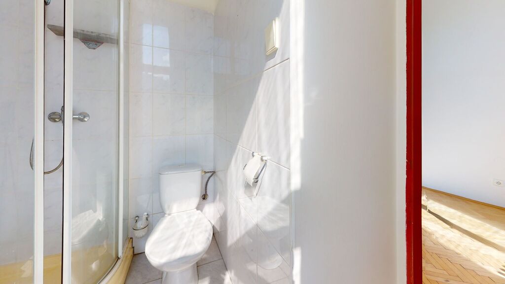 Budova je v dobrém stavu: zrekonstruovaná fasáda, společné chodby jsou v perfektním stavu.