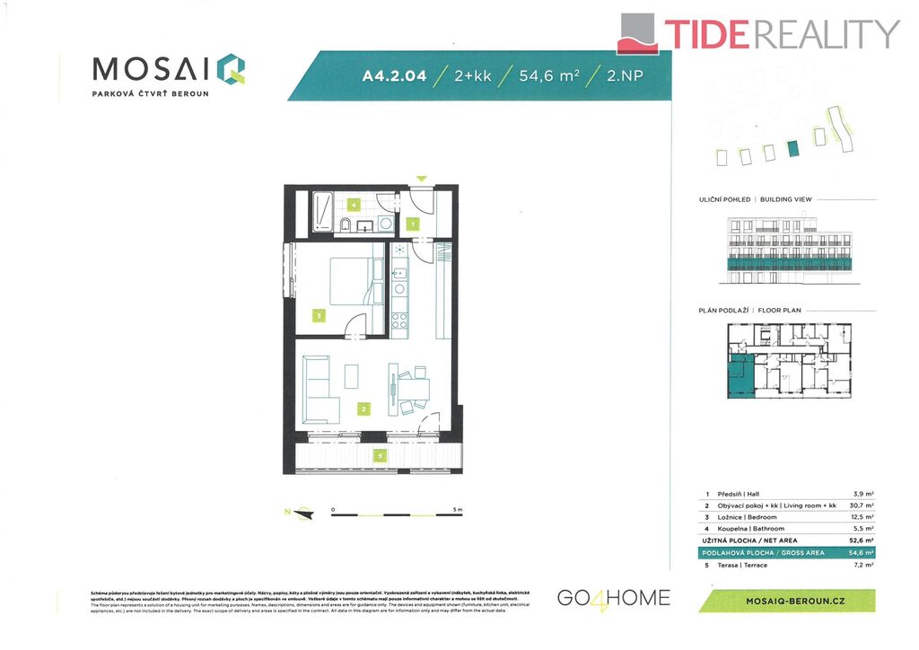 Tento konkrétní byt 2+kk o podlahové ploše 55 m2 s terasou 7 m2 se nachází ve 2.NP pětipodlažní budovy A4 a má velmi příjemnou západní orientaci.