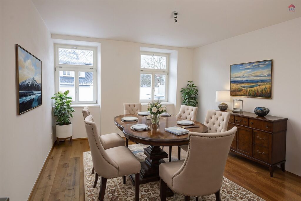 Celková obytná plocha bytu činí 103 m² a je ideálně rozložena pro maximální pohodlí a funkčnost. K dispozici jsou tři místnosti plus obytnou kuchyň s jídelním koutem, což poskytuje dostatek prostoru pro rodinné bydlení. Výška stropů dosahuje 3 metrů, což dodává bytu vzdušnost a prostor. Byt má navíc sklep o velikosti 5 m², který je ideální pro skladování sezónních věcí nebo dalšího vybavení.