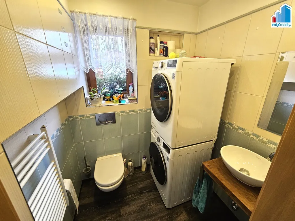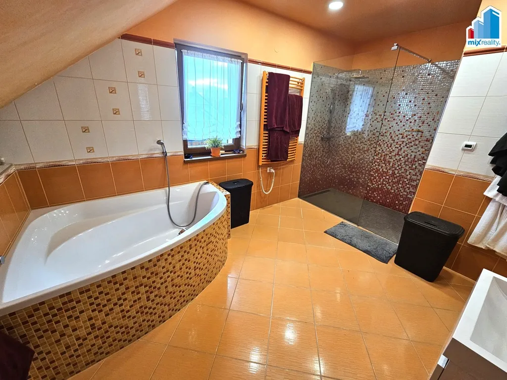 Dále je zde koupelna s vanou, sprchovým koutem, bidetem a toaletou.