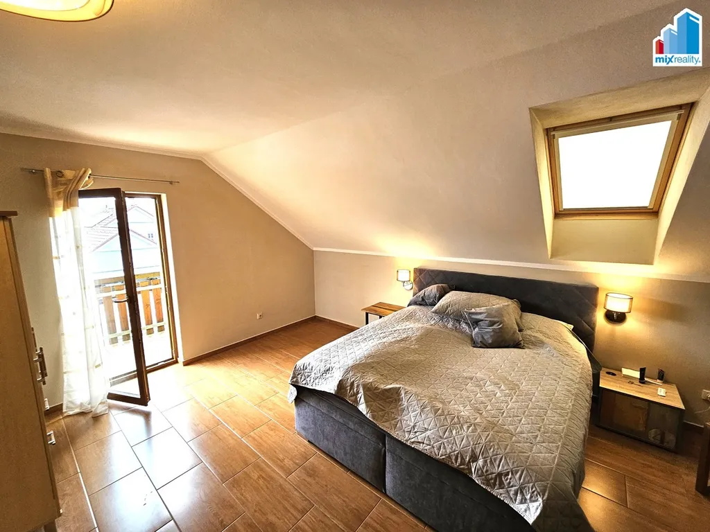 V patře se nacházejí tři pokoje. Jeden z nich je vybaven infrasaunou a další je velmi prostorný – má plochu 36 m². Z jednoho pokoje je vstup do prostorné šatny o velikosti 25 m².
