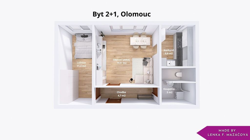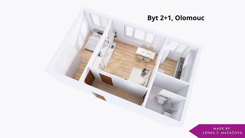 Kuchyně je vybavená kuchyňskou linkou s plynovým sporákem a troubou, digestoří, lednicí, což zajišťuje plný komfort při vaření. V prostorném obývacím pokoji nechybí rohová sedačka, obývací stěna a pod okny najdete jídelní stůl, vše v bílém Scandi stylu. V ložnici se nachází velká vestavěná skříň a postel. Vstupní chodba s velkým zrcadlem a stropním úložným prostorem, Vás přivítá příjemnou atmosférou. Z chodby máte přístup do ložnice, obývacího pokoje a koupelny. Koupelna je vybavena sprchovým koutem, pračkou, skříňky a příčkou částečně oddělené WC.