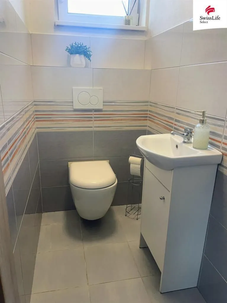 V patře je také moc pěkná koupelna a samostatná toaleta. Obojí opět v decentních barvách. Dvě umyvadla a vana se zajímavým designovým prvkem dělají z místnosti příjemnou oázu.