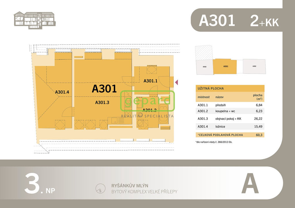 Realitní společnost Gepard nabízí k prodeji byt v OV 2+kk, 60,3m2 (užitná plocha 54,78m2) v developerském projektu Ryšánkův mlýn ve Velkých Přílepech z roku 2024 vzdálených od Prahy pouhých 6km a 15min autem.