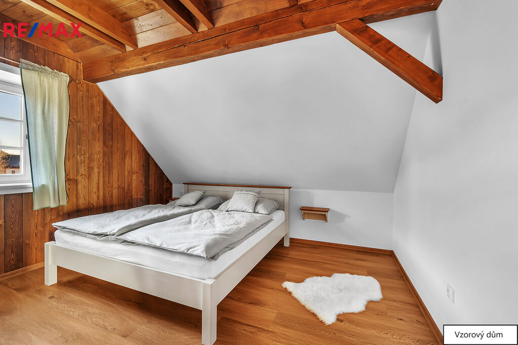 V podkroví se nachází čtyři pokoje 21,49m², 14,06m², 13,68m² a 11,86m², koupelna 5,03m², samostatné WC 2,66m². Všechny pokoje jsou neprůchozí a spojeny vstupní chodbou 4,82m². Zároveň lze ještě rozšířit užitnou plochu o dalších 34,8m² v takzvaném "Hambálku", kde lze mít spaní nebo místnost pro uložení věci, tato výměra není započítaná ve výměře 166m², tímto vybudováním vznikne celkově 201m².  Jedná se o roubenku č.2.