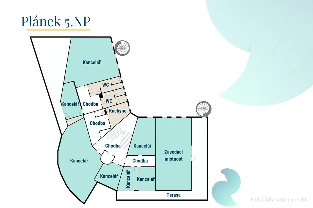 Nabízíme Vám 7 kanceláří ve 5.NP o rozloze 378 m2. Na patře je také společná kuchyňka a toalety. K využití dvě terasy o výměře 20 m2 a 63 m2.