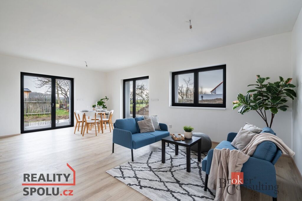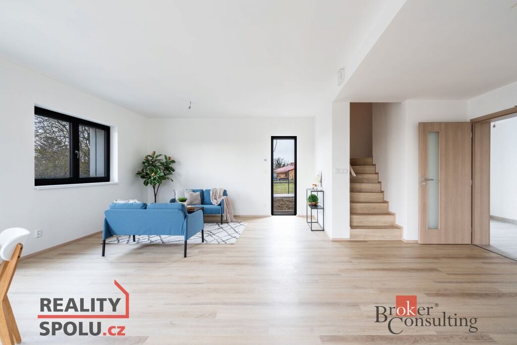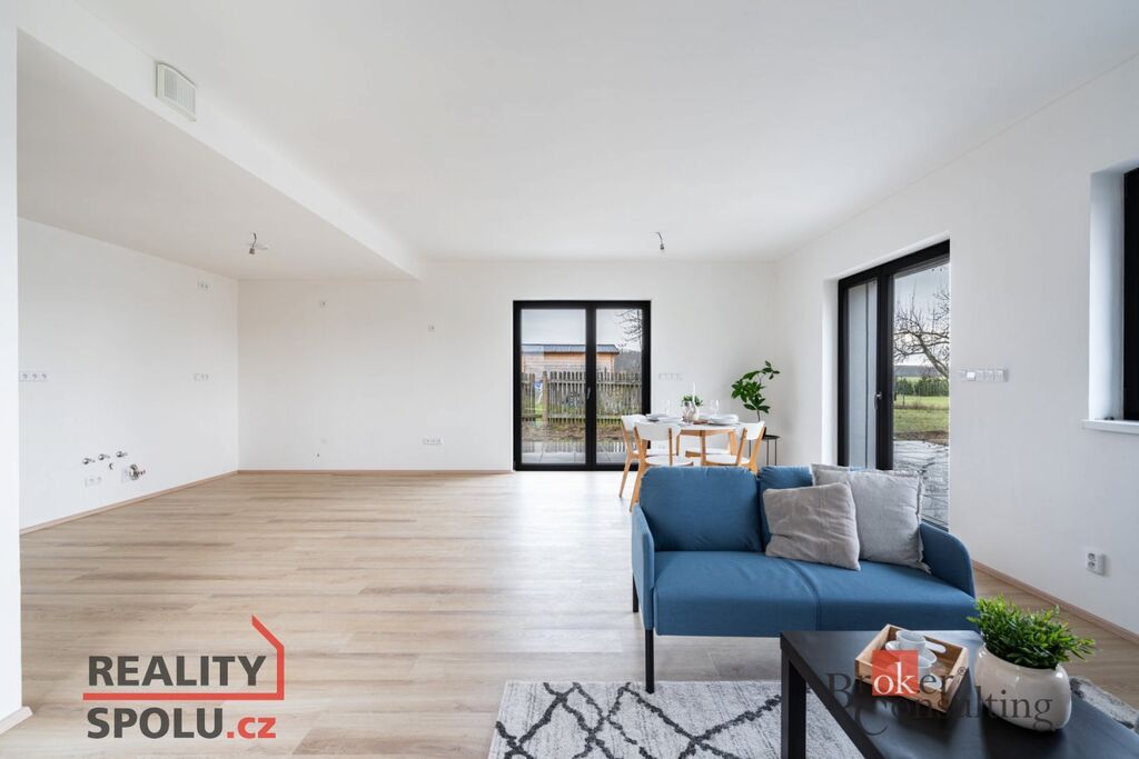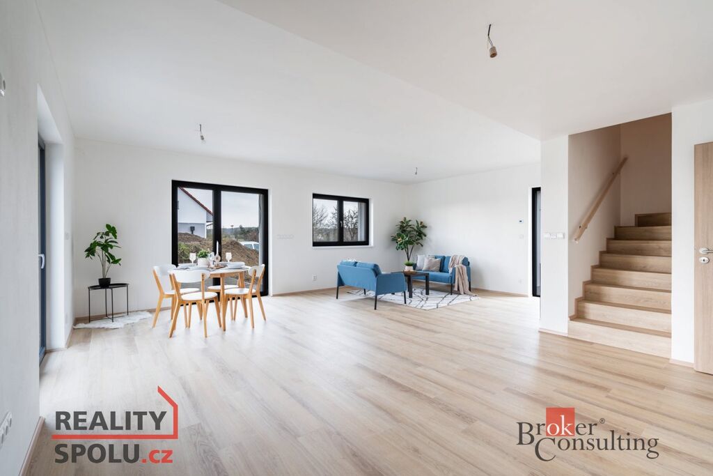 Jedná se o zděnou stavbu (Ytong) se dvěma nadzemními podlažími. Tato novostavba o dispozici 5+kk se nachází na pozemku o rozloze 665 m2, přičemž celková plocha domu činí 164,8 m2. V přízemí se nachází prostorný obývací pokoj spojený s kuchyní (41,1 m2) a vstupem na terasu (40 m2), dále je zde místnost, která může sloužit jako pokoj pro hosty či pracovna (11,8 m2), koupelna se záchodem (4,6 m2), technická místnost (2,9 m2) a ještě jedna menší místnost pod schody (4,0 m2). V prvním patře jsou dva pokoje s vlastní šatnou (17,8 m2 a 16,0 m2), dále ložnice (16,0 m2) se samostatnou šatnou (3,0 m2) přes chodbu a také druhá koupelna (6,1 m2). Jistě také oceníte pudní prostor o velikosti cca 40 m2.