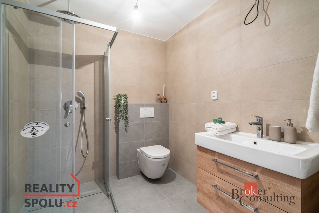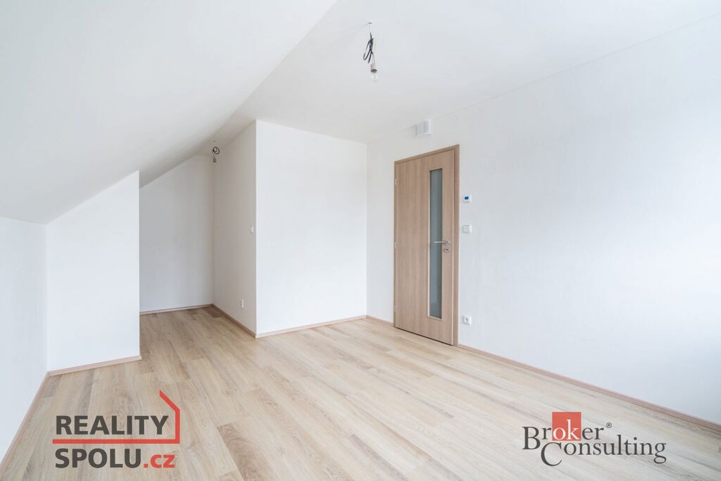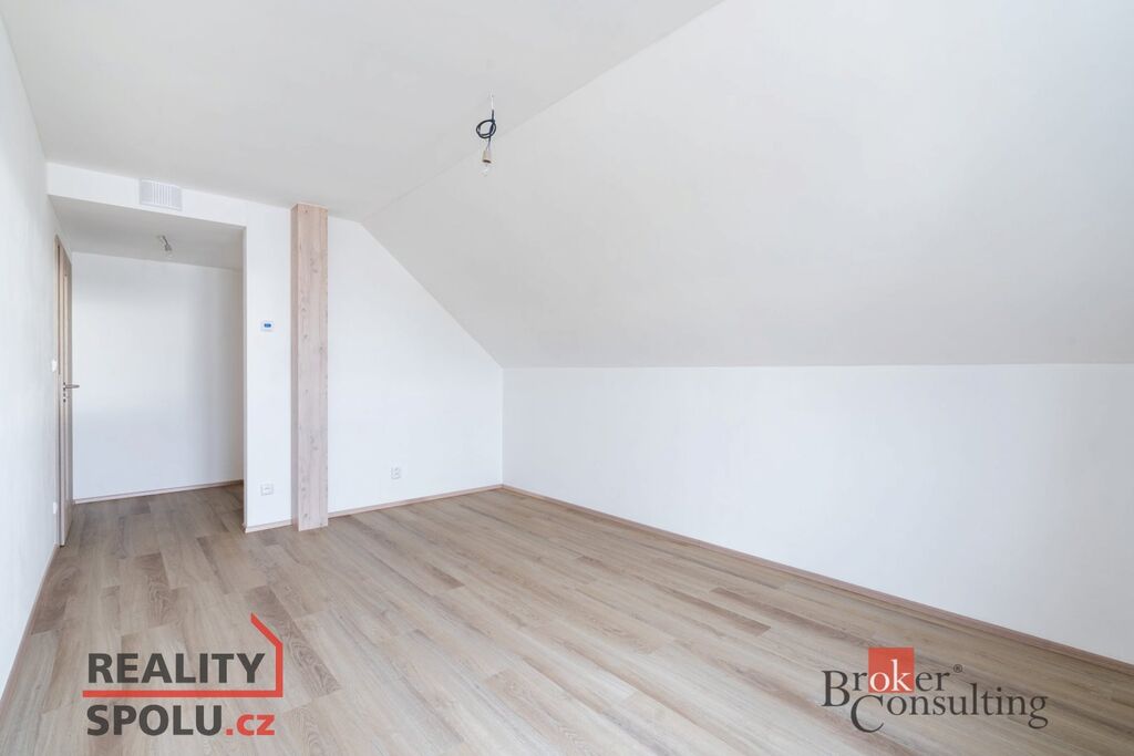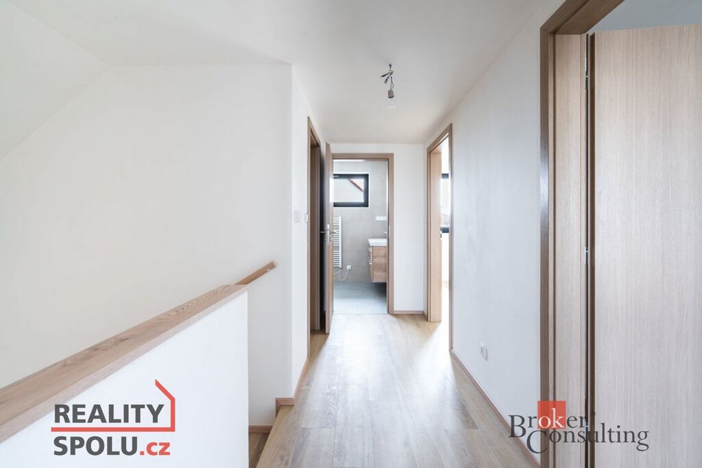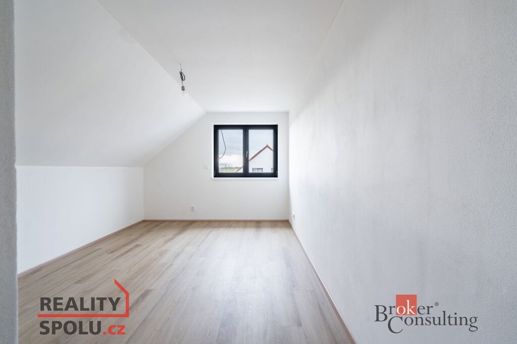 Jedná se o zděnou stavbu (Ytong) se dvěma nadzemními podlažími. Tato novostavba o dispozici 5+kk se nachází na pozemku o rozloze 665 m2, přičemž celková plocha domu činí 164,8 m2. V přízemí se nachází prostorný obývací pokoj spojený s kuchyní (41,1 m2) a vstupem na terasu (40 m2), dále je zde místnost, která může sloužit jako pokoj pro hosty či pracovna (11,8 m2), koupelna se záchodem (4,6 m2), technická místnost (2,9 m2) a ještě jedna menší místnost pod schody (4,0 m2). V prvním patře jsou dva pokoje s vlastní šatnou (17,8 m2 a 16,0 m2), dále ložnice (16,0 m2) se samostatnou šatnou (3,0 m2) přes chodbu a také druhá koupelna (6,1 m2). Jistě také oceníte pudní prostor o velikosti cca 40 m2.