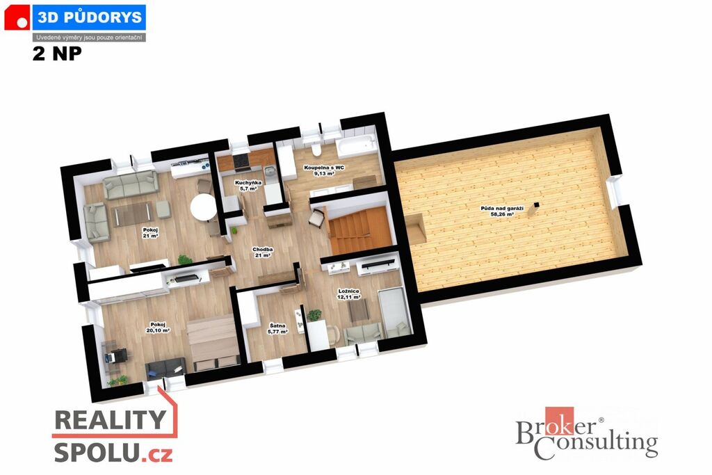 Do patra se dostanete dřevěným schodištěm. V patře domu se nacházejí ložnice, obývací pokoj, kuchyňská linka s vestavnou troubou a varnou deskou. Dál pokoj pro hosty či herní místnost a koupelna s vanou, sprchovým koutem a WC.