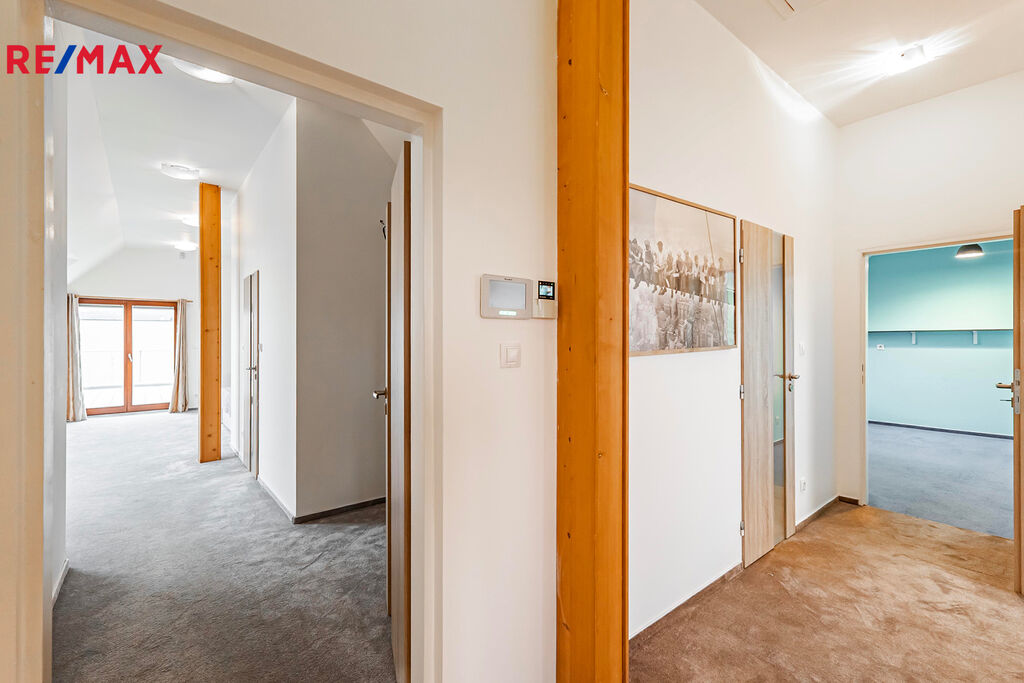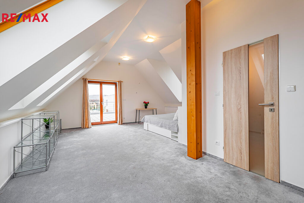 V patře najdete čtyři prostorné ložnice a dvě koupelny. Jedna z ložnic má přímý vstup na velkou terasu, která je ideálním místem pro relaxaci s výhledem na okolní zeleň.