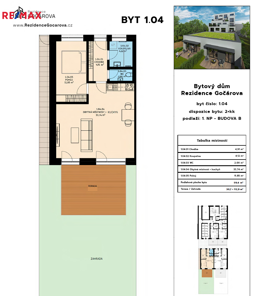 Byt číslo 104 o dispozici 2+kk (59,6 m²), s celkovou plochou k užívání 203,2 m², je umístěn v zeleném vnitrobloku bytového domu. Pyšnit se může 30,7 m² velikou terasou, která plynule navazuje na vlastní soukromou zahradu o výměře 112,9 m², na které můžete příjemně relaxovat, grilovat a užívat si zeleného vnitrobloku. Vzhledem k tomu, že se nacházíme v atraktivní části města, je jakákoliv možnost vlastnictví zahrady se zelení poměrně vzácná.
