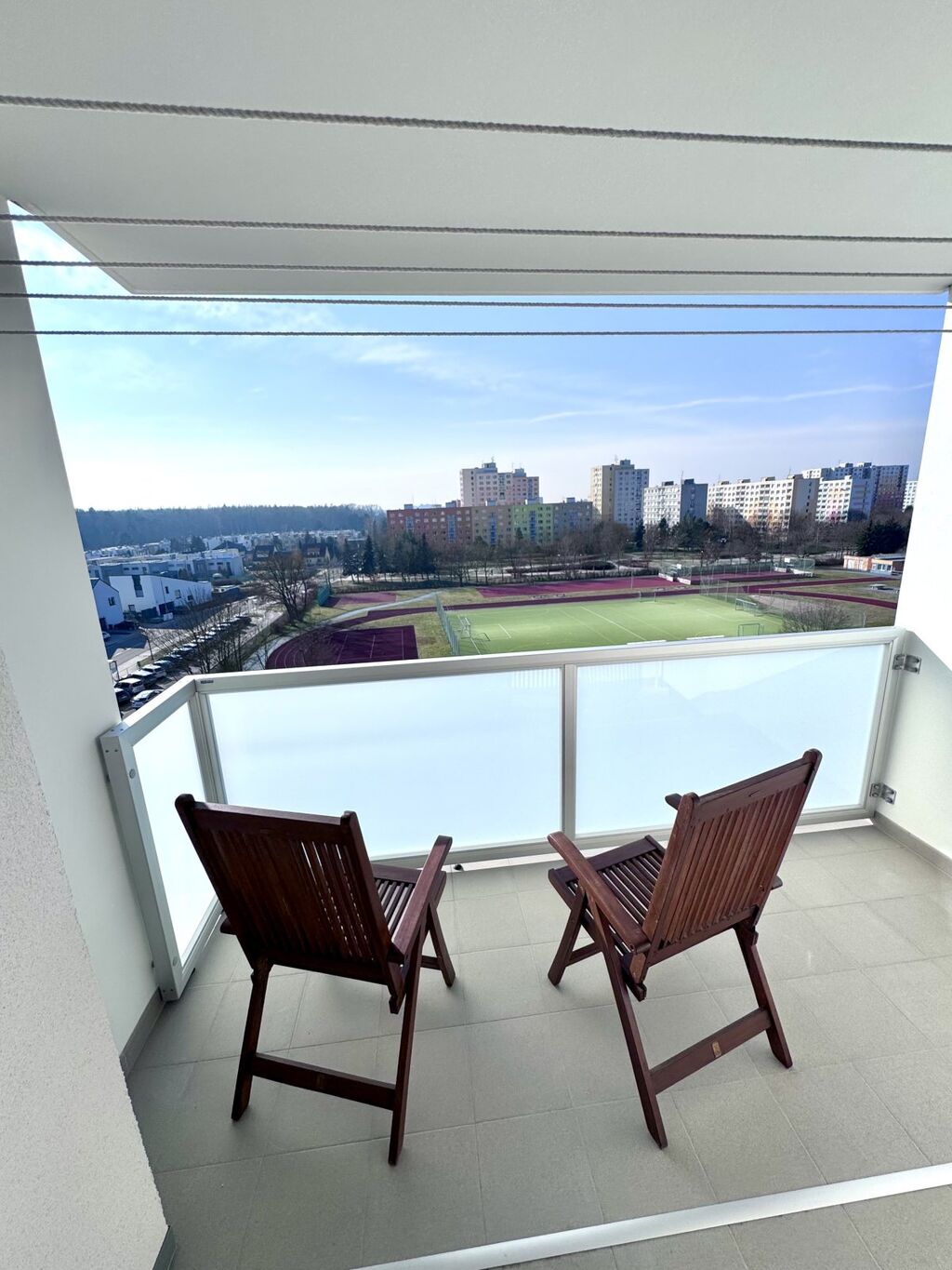 Zánovní bytová jednotka o výměře 77 m², se nachází v posledním šestém patře domu což zajišťuje klid a krásný výhled z pětimetrové terasy.