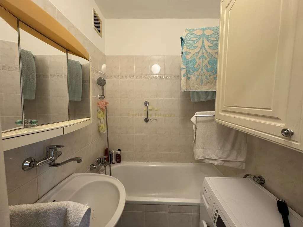 Vybavení bytu: kuchyňská linka s plynovým sporákem a elektrickou troubou, lednice, digestoř, pračka v koupelně, stůl se židlemi v jídelně, obývací prostor je rovněž v základu vybaven. V ložnicích jsou postele, psací stůl a rovněž i knihovna. Byt bude volný v březnu, jedná se o dlouhodobý pronájem.