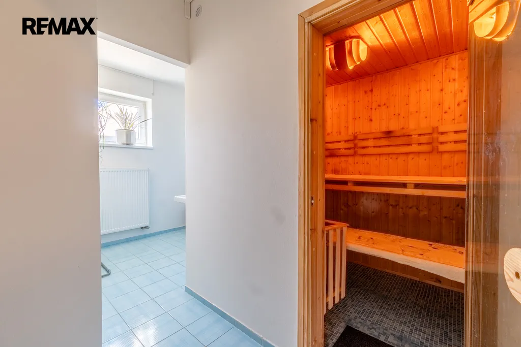 Spodní patro (PP) – samostatný apartmán s krbem, ložnicí, kuchyní, koupelnou, saunou a zimní zahradou s vlastním vstupem; ideální pro prarodiče, dospívající děti nebo hosty.