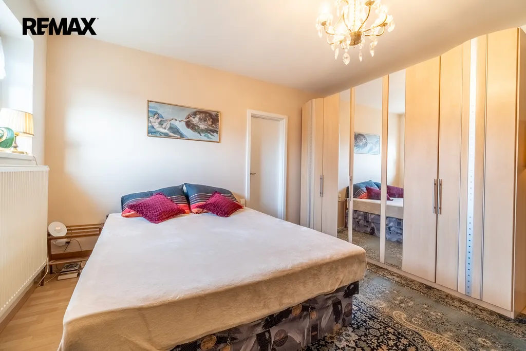 Horní patro (2. NP) – 4 pokoje s vlastní koupelnou a WC, 2 pokoje mají francouzský balkon; každý člen domácnosti má své soukromí.