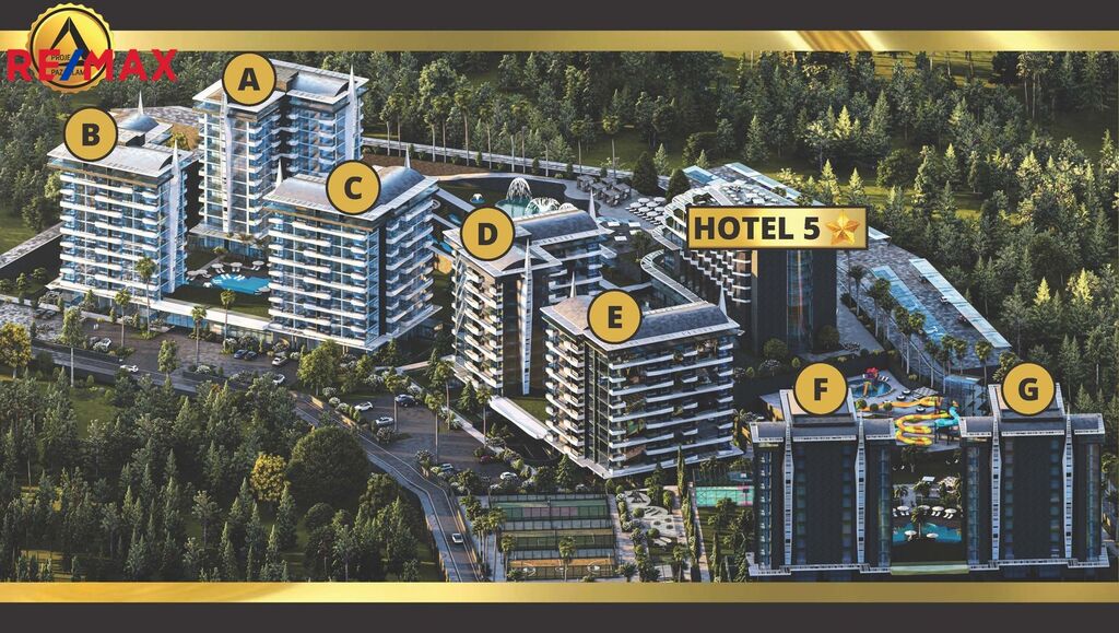 Představují byt v unikátním luxusním komplexu, který se nachází v chráněné oblasti, uprostřed jehličnatého lesa, nedaleko růžové písečné pláže. V okrese Avsalar na severu Alanye a je považován za jednu z nejkrásnějších oblastí. Projektová oblast zajímá - 52.000 m2 se vzdáleností k moří - 900 m. Začátek stavby - 30.06.2023 a konec 30.06.2025 roku. Na území se nachází luxusní 5tihvězdičkový hotel s bohatou infrastrukturou, kde je zajištěno vše pro pohodlný pobyt: bazény, vodní plochy, fitness, lázně, park, sportovní a zábavní prostory, lobby, recepce, ostraha a mnoho dalšího. Majitelé v obytném komplexu mohou používat celou hotelovou infrastrukturu.
