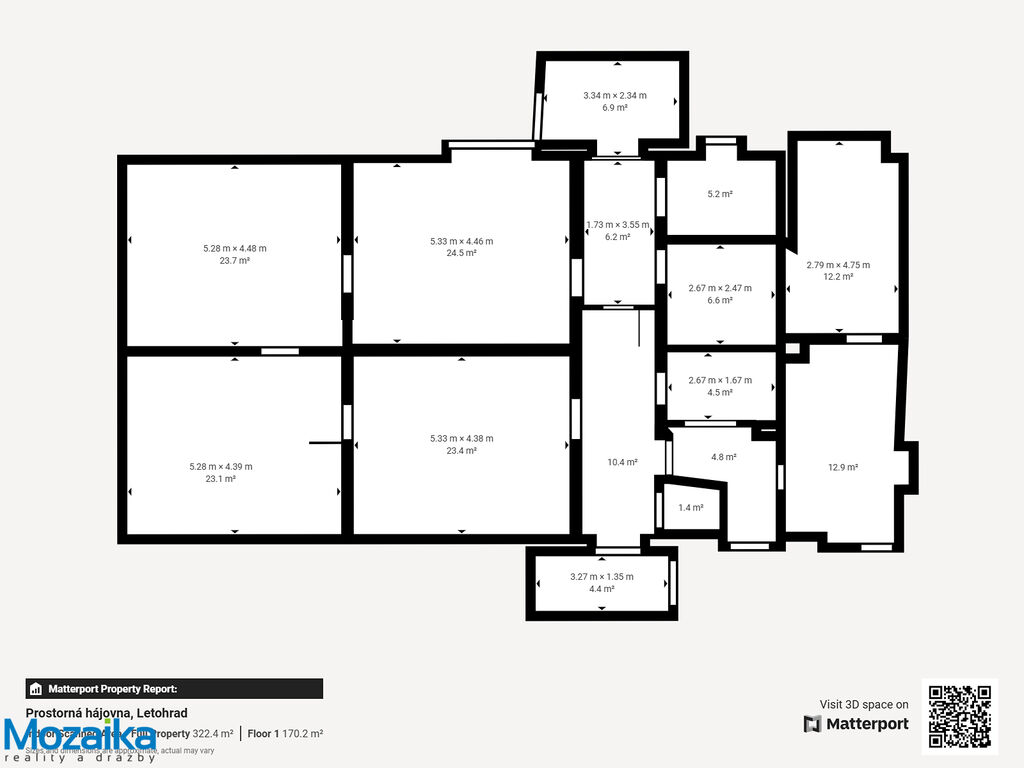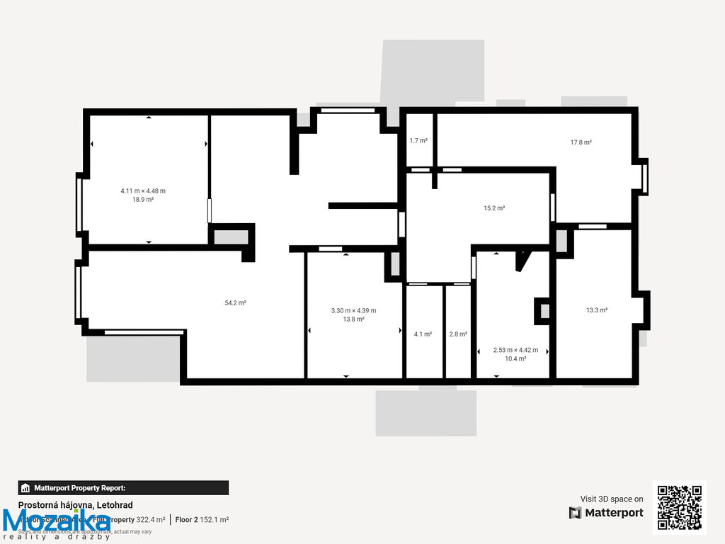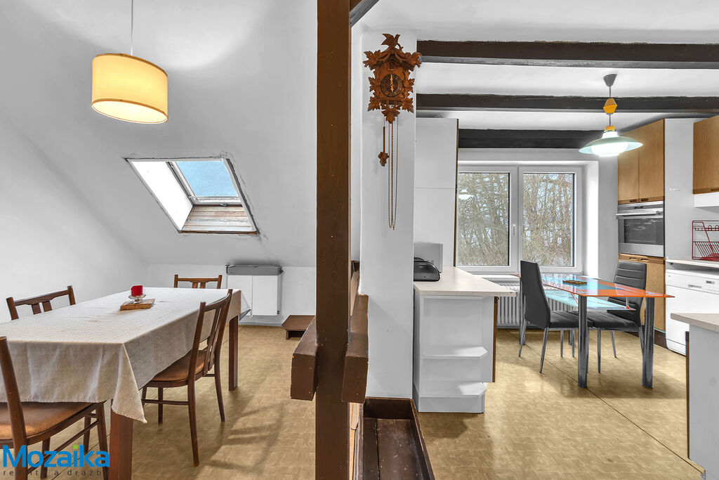 Jedná se o dvoupodlažní cihlový dům bez podsklepení, jehož celková užitná plocha činí 322 m2. Zastavěná plocha domu a nádvoří dosahuje 446 m2, zatímco přilehlá zahrada o rozloze 729 m2 poskytuje dostatek prostoru pro odpočinek, zahradničení nebo rodinné aktivity. Dům je obklopen oplocenou zahradou, která zajišťuje soukromí a klidné prostředí. V přízemí se nachází bytová jednotka o dispozici 3+1, která zahrnuje kuchyň, tři prostorné pokoje, spíž, kotelnu a sklad paliv. Tato část domu je připravena k dokončení, a nový majitel tak může popustit uzdu své představivosti a přizpůsobit ji svým potřebám. Podkrovní bytová jednotka o dispozici 3+kk s lodžií je naopak ve stavu umožňujícím okamžité nastěhování. Díky tomu je nemovitost ideální i k dvougeneračnímu bydlení, přičemž obě bytové jednotky lze oddělit a zajistit tak maximální soukromí obyvatel.