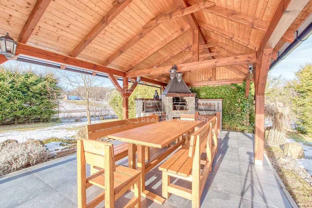 Okrasná zahrada s ovocnými keři a lipová terasa s posezením a krbem nabízejí dokonalé soukromí a prostor pro relaxaci. Koupací sud pro 4-6 osob a dílna pro zahradní nářadí jsou třešničkou na dortu. Celý pozemek je obehnán masivním jasanovým plotem, který zajišťuje pocit bezpečí.