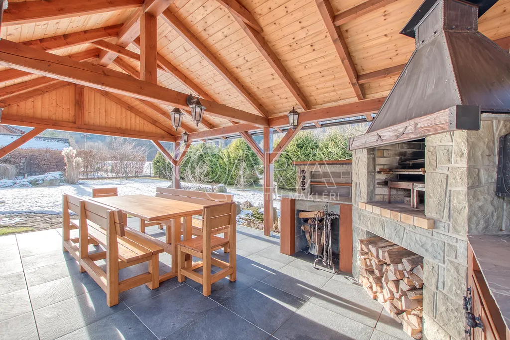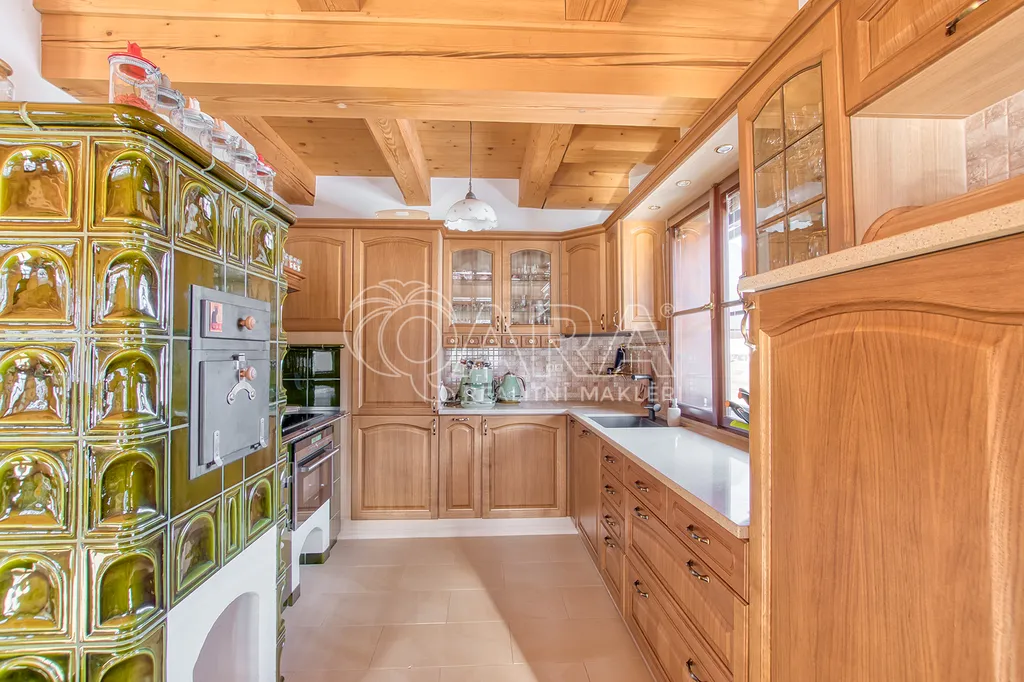 Již při vstupu vás okouzlí dominantní obývací pokoj s krbem a kuchyní, kde se stylová kachlová kamna stávají srdcem domova. Nadstandardní vybavení značkovými spotřebiči a promyšlené designové prvky svědčí o nekompromisní kvalitě a vkusu majitelky, která se o tento dům s láskou stará od jeho výstavby.