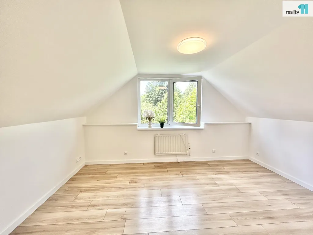 Po schodech nahoru z obývacího pokoje se nachází dva samostatné pokoje (15m² a 16m²) a druhá koupelna se sprchovým koutem a WC.