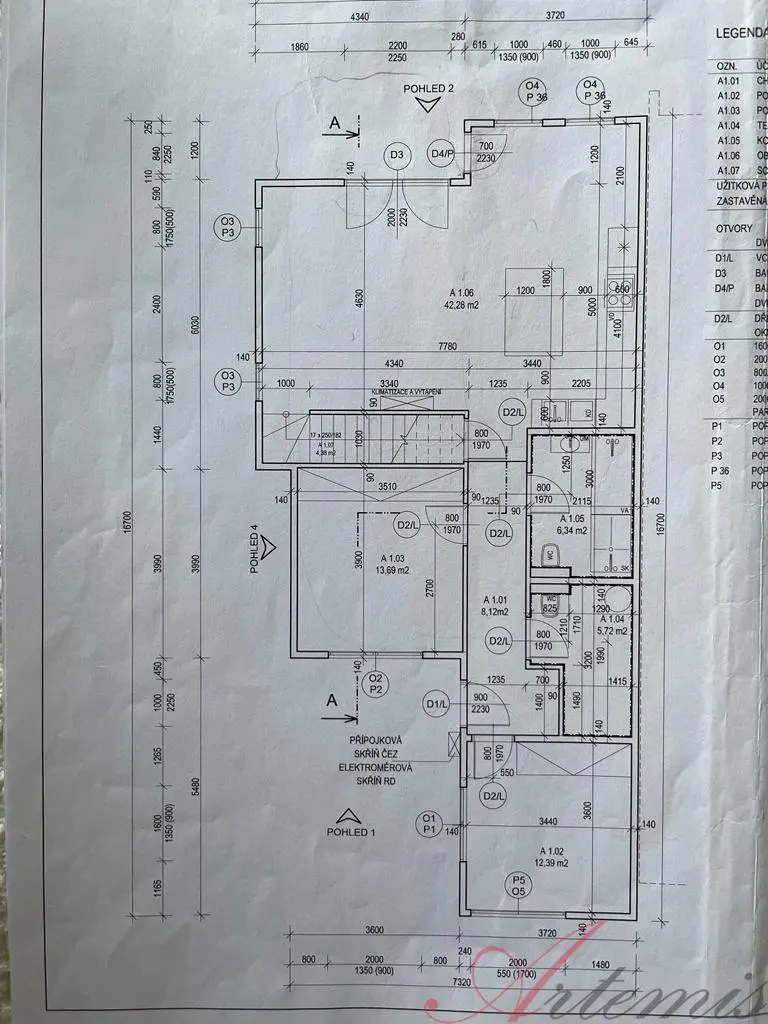 V domě se nachází: 1NP. 2 pokoje s vestavěnou skříní, technická místnost s WC, koupelna s vanou, sprchou a WC, obývací pokoj propojen s kuchyní a výstupem na terasu, elektrická markýza proti slunci. Schodiště do 2NP: Podkrovní ložnice s koupelnou a WC, vestavěné skříně.