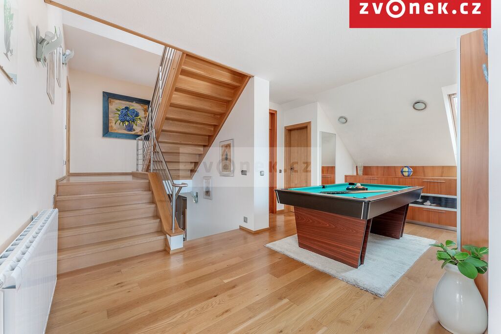 Dále se v přízemí nachází komfortní vstupní hala s šatnou s přístupem na WC, a prostorný pokoj pro hosty se samostatnou koupelnou. Po schodišti z masivu vyjdete do patra, kde jsou další dvě samostatné ložnice a k nim přiléhající koupelna s WC, k dispozici jsou zde dvě šatny a herna. V dalším podlaží je prostorná klimatizovaná ložnice se šatnou a navazující koupelnou s WC a přiléhající velká nadstandardní šatna, využitelná i jako pracovna nebo samostatná ložnice. V neposlední řadě je v podkroví pracovna s úložným prostorem a vstupem na funkční půdu.