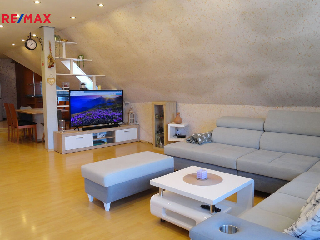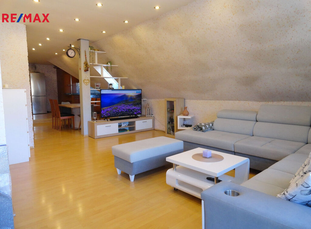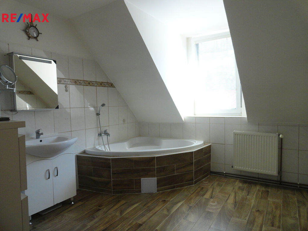 Nabízíme k prodeji výjimečný byt v osobním vlastnictví v Nižboru. Nachází se ve 2. patře (3. NP) bytového domu. Dispozice bytu je 3 + kk, ovšem netypického uspořádání. Po opuštění předsíně se před námi otevře ohromný prostor, který spojuje velkou kuchyň s jídelnou a obývacím pokojem. Z něj vedou dveře do rozlehlé koupelny s rohovou vanou, na toaletu a do dvou ložnic. Jídelna a obývací pokoj jsou částečně rozdělené stěnou na uložení květin a dekorací. V obývací části si můžeme odpočinout na velké sedací soupravě před televizí. Před vchodem do bytu je praktický kumbál a stojan na jízdní kola.