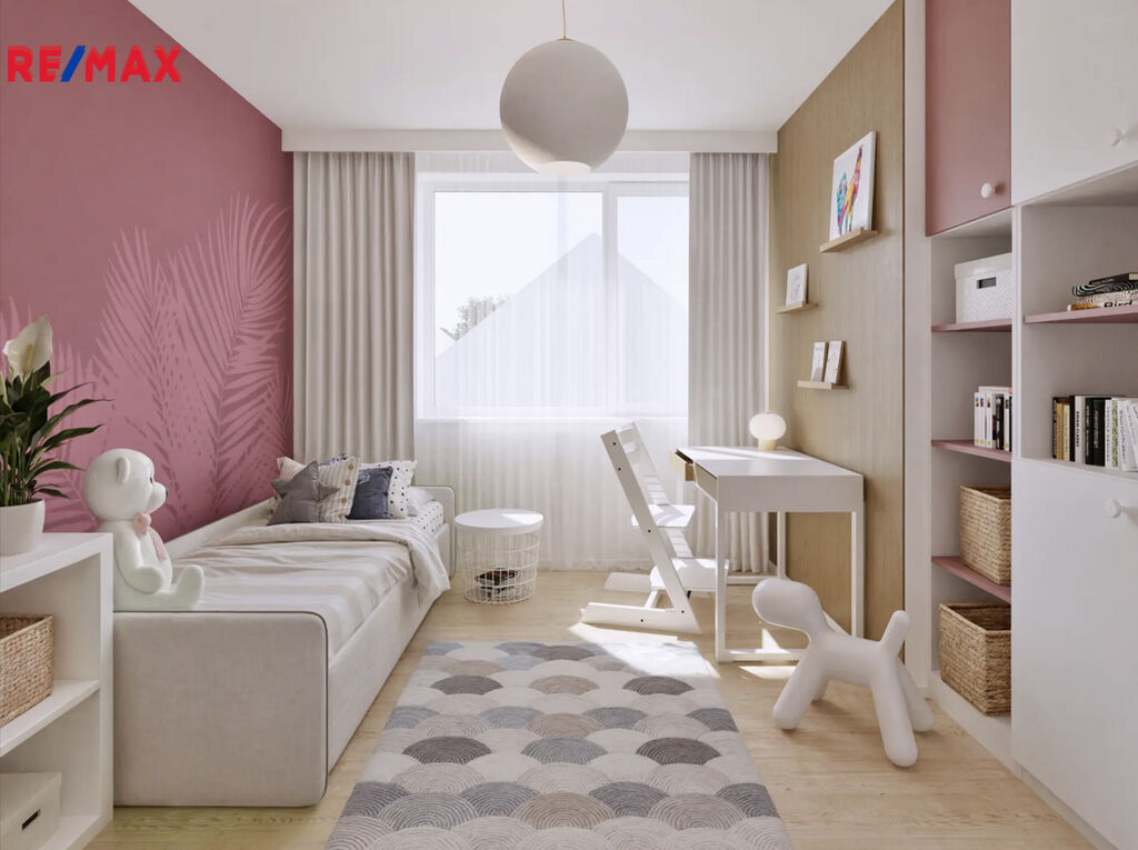 V přízemí domu bude vstupní chodba se schodištěm do patra, kde při vstupu budete mít po pravé straně koupelnu se sprchovým koutem a WC, na levé straně bude výklenek pro vestavěnou šatní skříň. Dále menší pokoj vhodný jako ložnice nebo pracovna. Rovně z chodby projdete do velkého obývacího pokoje, který bude spolu s velkým kuchyňským koutem a jídelnou dominantou celého domu. Z tohoto obývacího pokoje bude vstup na zahradu s terasou, kde si můžete postavit pergolou. Zahrada bude oplocená se zadní brankou pro pěší vstup. V chodbě domu pod schodištěm budete mít úložný prostor a v patře na vás budou čekat tři pokoje a hlavní koupelna s vanou a WC. Jako bonus vám zhotovíme plnohodnotnou velkou místnost v podkroví, kam povede běžné schodiště. Podkrovní pokoj bude mít všechny náležitosti jako jsou střešní okna, podlahovou krytinu, sádrokartonové podhledy i rozvody elektřiny. Tento podkrovní prostor můžete využít jako ložnici, pracovnu nebo hernu. Velkoformátová okna zajistí dostatek přirozeného světla a příprava na venkovní žaluzie umožní regulaci teploty v interiéru. Před domem budou dvě parkovací stání. Tepelné čerpadlo bude umístěné směrem do ulice.