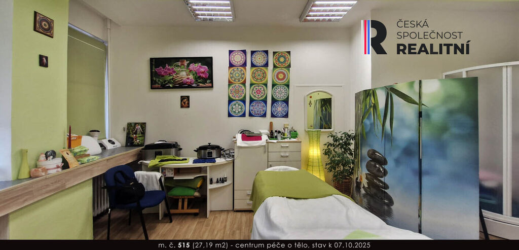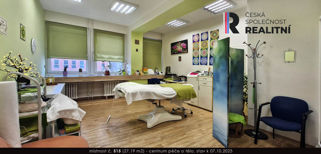 Místnost je zkolaudována jako "provozovna péče o tělo", v místnosti je k dispozici umyvadlo a sprchový box. Místnost je tedy vhodná pro provoz masérství, kadeřnictví, pedikúra, manikúra.