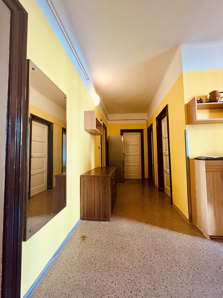 Interiér tvoří prostorná vstupní hala s komodami, skříní a lednicí naproti vstupu do kuchyně. Další vstupy nabízí jeden průchozí pokoj a tři pokoje neprůchozí. Vstup do koupelny s vanou a pračkou. Samostatnou toaletu a vstup na lodžii, kde je výhled do dvora klidného vnitrobloku.