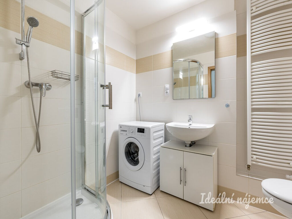 Byt se nachází ve zvýšeném přízemí cihlového domu. Skládá se ze vstupní chodby vybavené vestavnou šatní skříní, koupelny společné s toaletou zařízené zařízené pračkou, sprchovým koutem a umyvadlem.