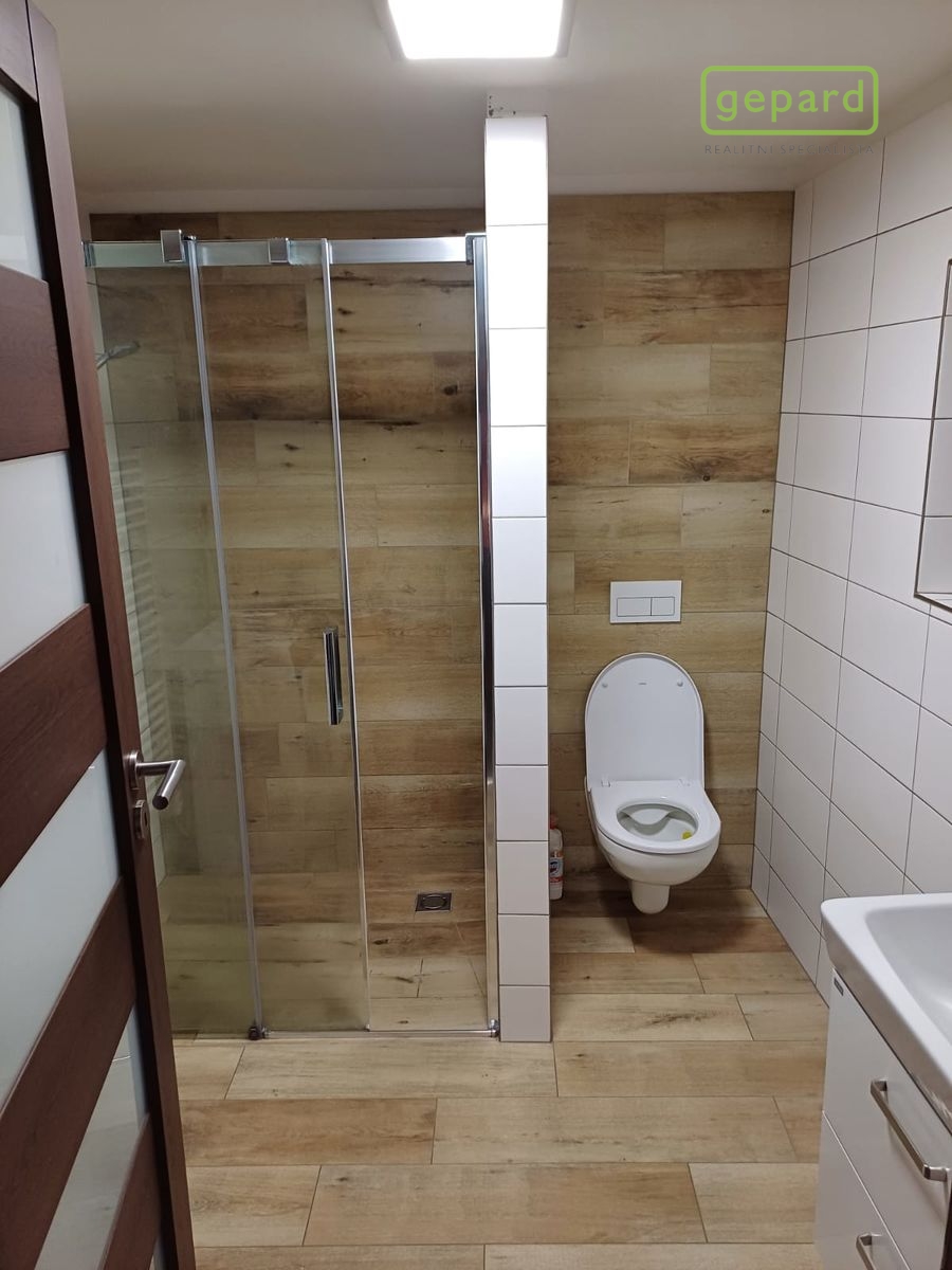Naproti schodišti je dále v patře koupelna se sprchovacím koutem a toaletou. Chodba pokračuje do menšího pokoje a navazující ložnice. Z těchto pokojů je taktéž výhled na město. Podlahová krytina dlažba a plovoucí, nová dřevěná okna, masivní interiérové dveře, nové rozvody elektřiny, vody a topení. Vytápění je zajištěno tepelným čerpadlem a ústředním topením s měsíčním nákladem cca 3 000,- Kč.