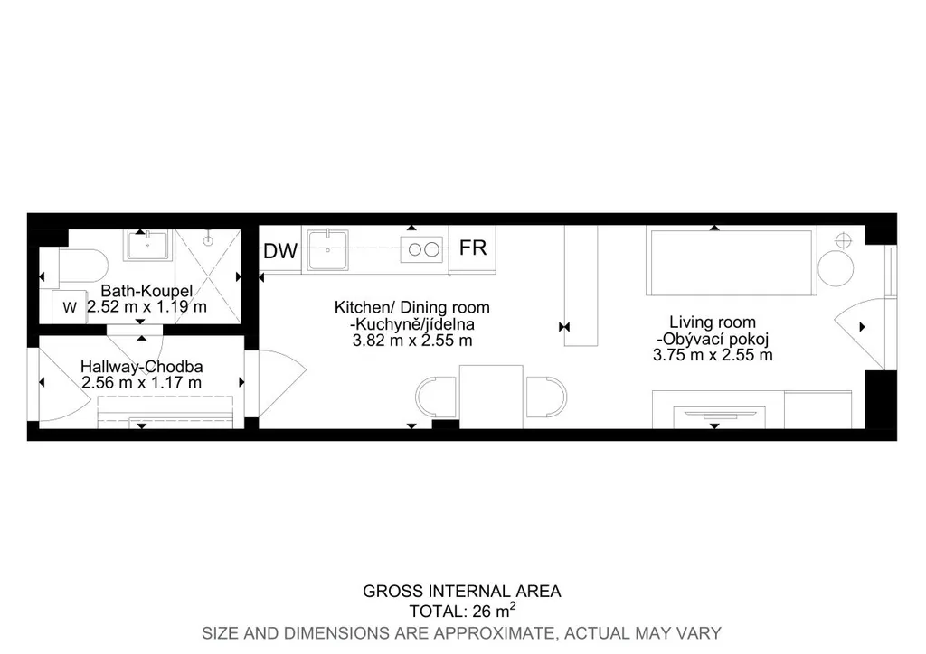 Byt se nabízí plně vybavený. Kuchyně disponuje lednicí, myčkou, elektrickou troubou, varnou deskou, mikrovlnnou troubou, rychlovarnou konvicí a digestoří. Obývací část je oddělena a zařízena rozkládací postelí, včetně matrací, lůžkovin a ložního prádla, tv stěnou, televizí, jídelním stolem a židlemi. V koupelně je sprchový kout, umyvadlo, toaleta, pračka i ručníky. Základní internetové připojení je v ceně služeb.