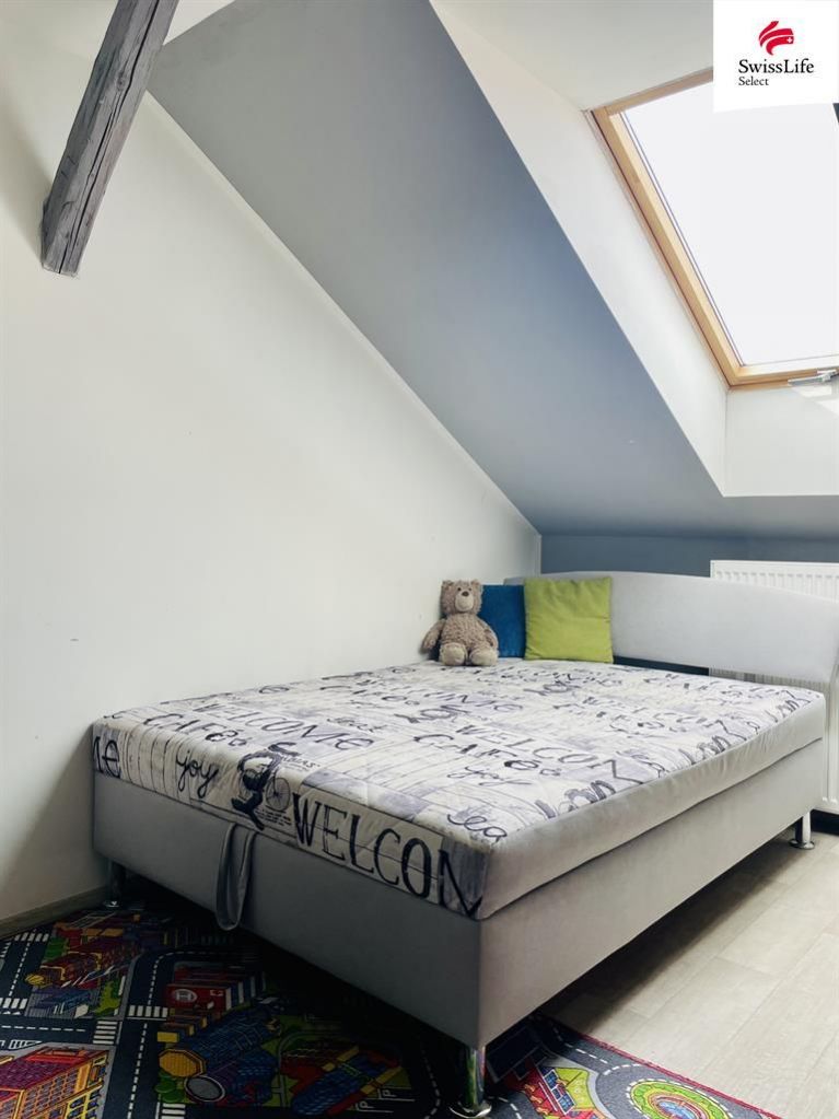 V patře je ložnice a pokojíček, díky střešním oknům jsou oba pokoje plné světla. Zajímavými prvky jsou přiznané trámy. Je tady světlá místnost připravená na horní koupelnu. Zároveň je zde nevyužitý prostor s bočním schodištěm do patra, s přístup ze zahrady. Sem lze umístit druhý pokojíček, k čemuž by se dala využít i další místnost, nyní využitá jako pracovna/šatna.
