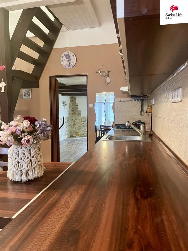 Hlavní částí bytu je prostorná kuchyně s moderní linkou, která přesahuje do jídelního stolu, ke kterému se vejde i velká rodina. Odsud je zároveň vstup do malé koupelny se sprchovým koutem a také do technické místnosti s úsporným plynovým kotlem. Za kuchyní je obývací pokoj se sníženým stropem. Zvláštností této místnosti je prostor na spaní. Rozlehlý podstropní pelíšek lze využít i jako úložný prostor, anebo pro větší vzdušnost lze demontovat a zvětšit tak obytnou část. Je to místo velmi oblíbené dětmi a pokud jste větší rodina, jistě toto místo najde své uplatnění. Vedle pokoje je ještě šatna nebo spižírna.