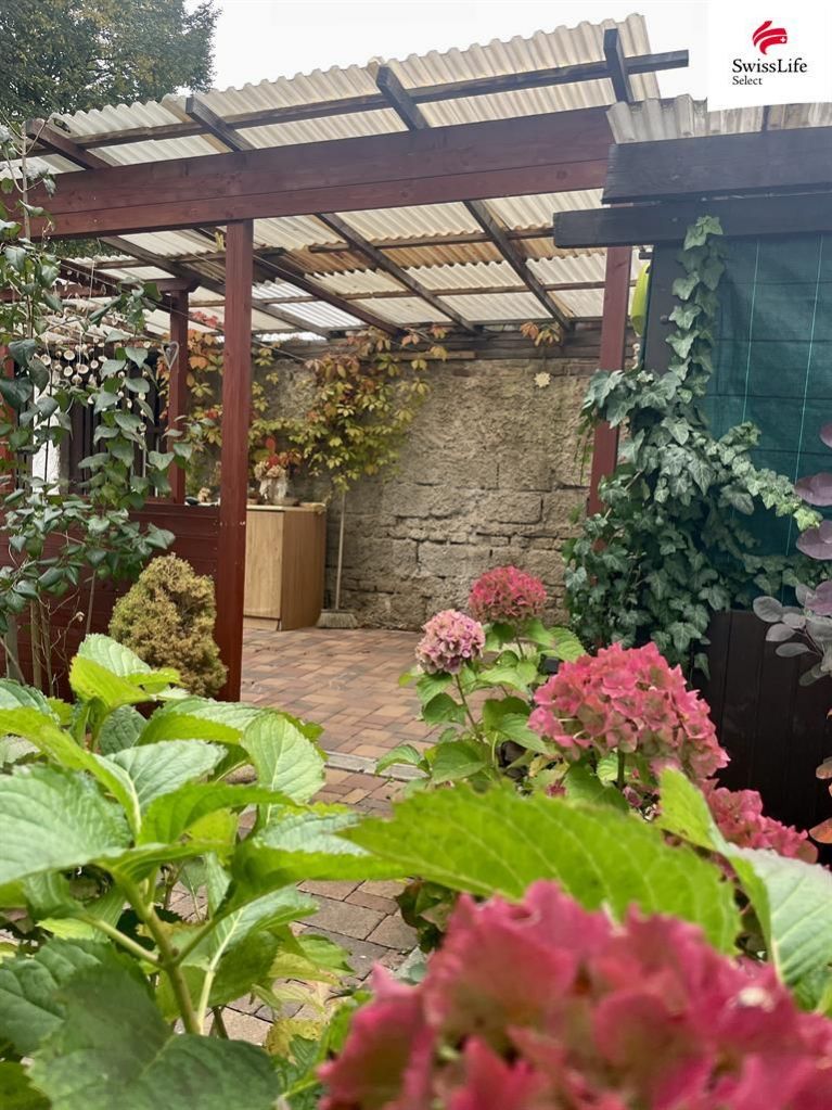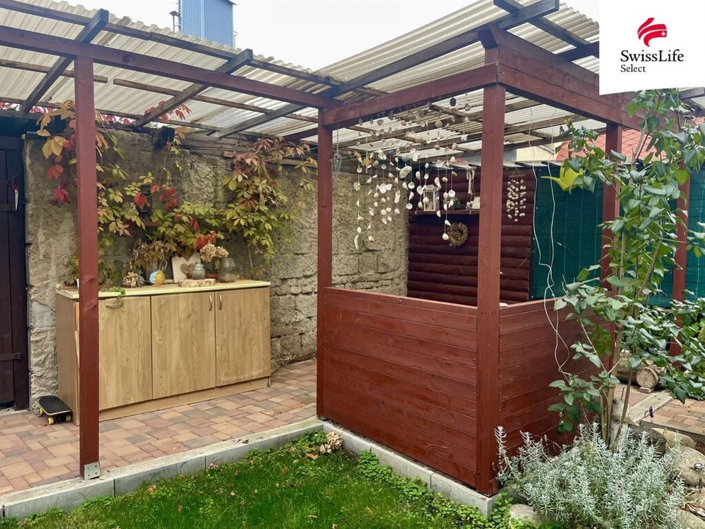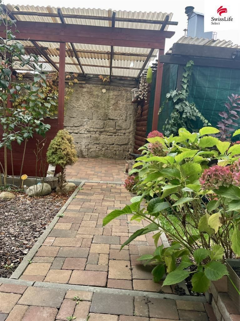 Odsud je také vstup na malou zahrádku s pergolou. Celá část je pohodlně zpevněná dlažbou a ranní káva na sluníčku bude mít blahodárný vliv na úroveň vašeho nového bydlení.