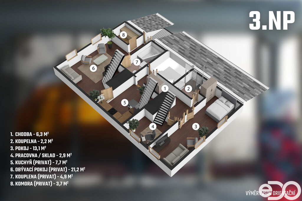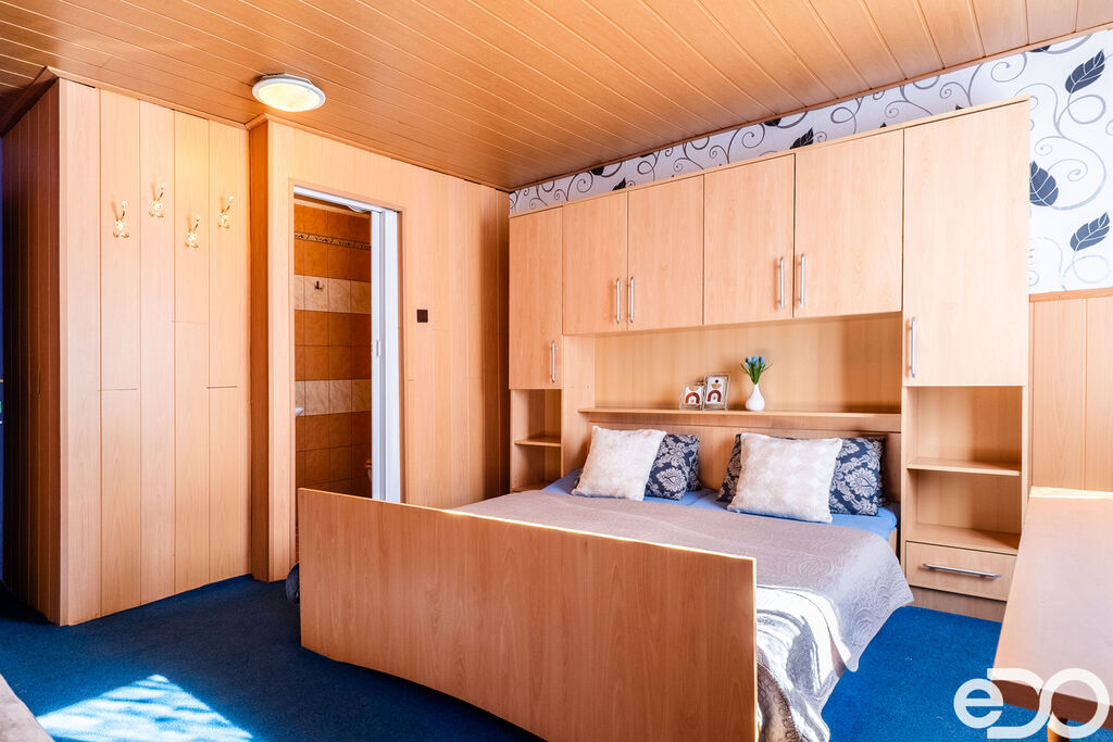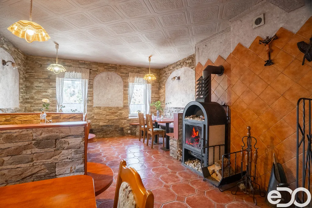 Dvě nadzemní podlaží a podkroví, celková užitná plocha je 290 m². Výměra je pouze orientační. K nemovitosti dále patří sklep a dílna na zahradě. Najdete zde 5 pokojů, společenskou místnost s krbem, kuchyň, technické zázemí a samostatný byt v podkroví. Hlavní zdroj vytápění jsou akumulační kamna, k vytápění slouží také přímotopy a krbová kamna s výměníkem napojená na radiátory a teplou vodu zajišťují bojlery. Napojeno na veřejný vodovod, odpad sveden do septiku – kanalizační přípojka je cca 10 metrů od domu, stačí ji dodělat. Nad podkrovím je navíc půdní prostor (cca 67 m²), využitelný jako sklad nebo úložné zázemí.
