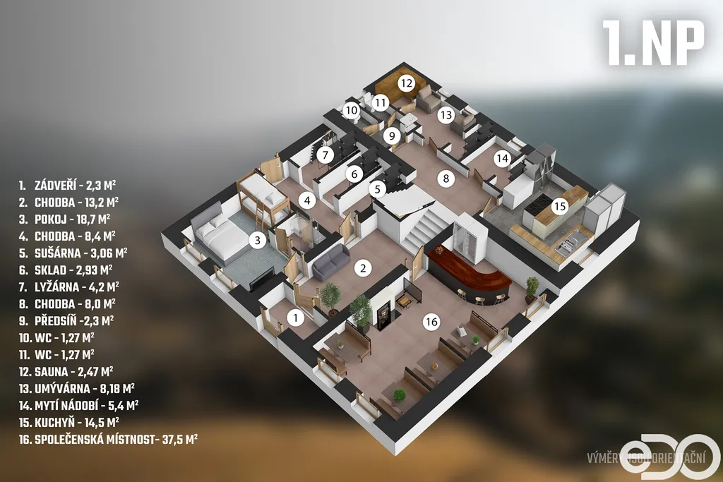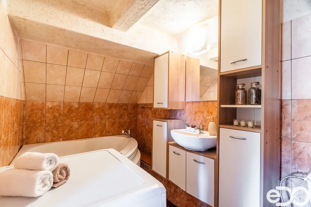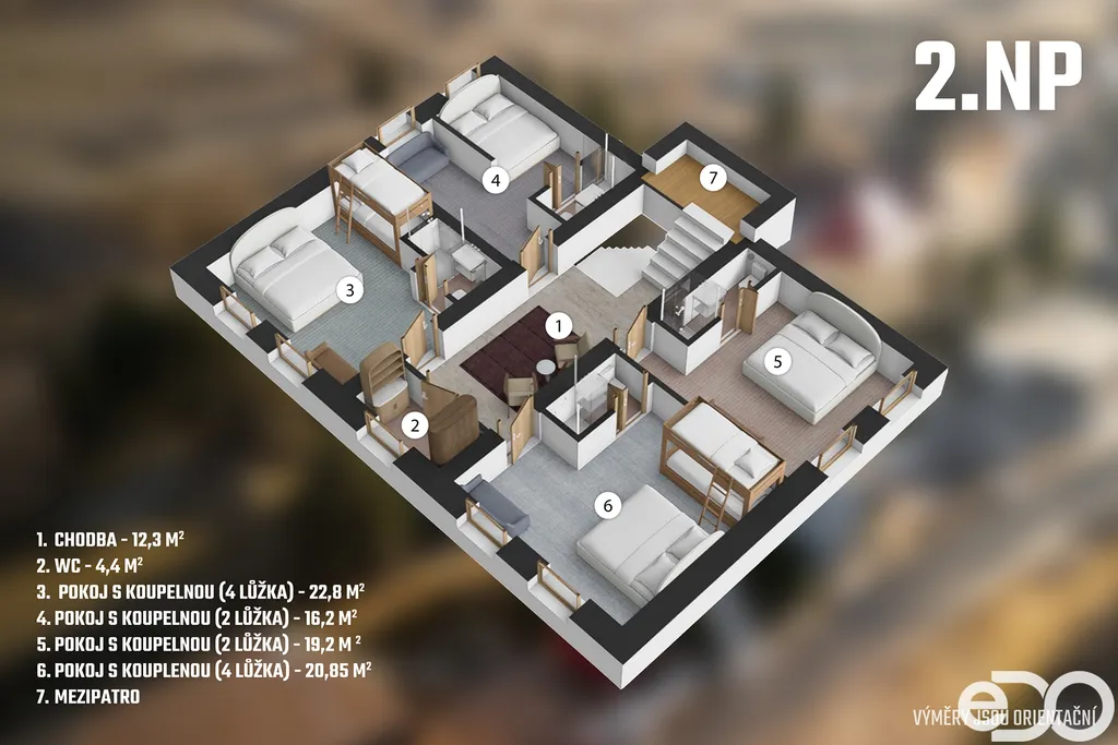 Dvě nadzemní podlaží a podkroví, celková užitná plocha je 290 m². Výměra je pouze orientační. K nemovitosti dále patří sklep a dílna na zahradě. Najdete zde 5 pokojů, společenskou místnost s krbem, kuchyň, technické zázemí a samostatný byt v podkroví. Hlavní zdroj vytápění jsou akumulační kamna, k vytápění slouží také přímotopy a krbová kamna s výměníkem napojená na radiátory a teplou vodu zajišťují bojlery. Napojeno na veřejný vodovod, odpad sveden do septiku – kanalizační přípojka je cca 10 metrů od domu, stačí ji dodělat. Nad podkrovím je navíc půdní prostor (cca 67 m²), využitelný jako sklad nebo úložné zázemí. U fotografií jsou využity i vizualizace ve velmi nízkém rozsahu.