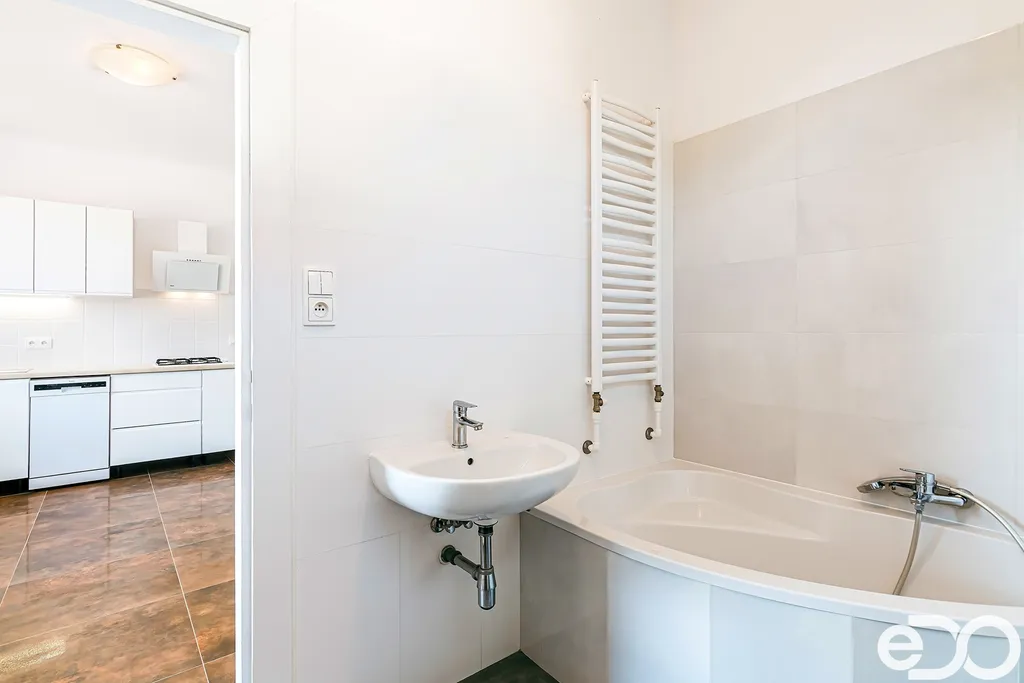 Koupelna je rovněž po rekonstrukci, nová dlažba, obklady a sanita – rohová vana, umývadlo, WC, dále příprava vody a odpadu pro pračku.