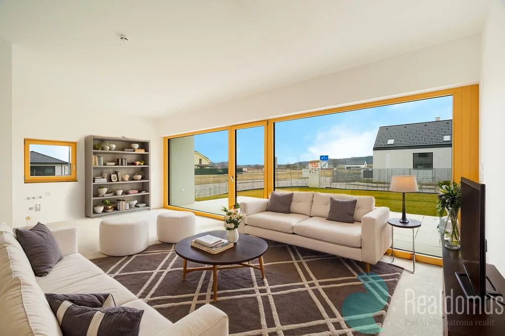 Dům je navržen v moderním architektonickém stylu s důrazem na čisté linie a elegantní kombinaci fasádních materiálů. Konstrukčně spolehlivý, postavený z tradičních kvalitních materiálů, s dřevo-hliníkovými okny a dveřmi, betonovou taškou a dalšími nadstandardními prvky.