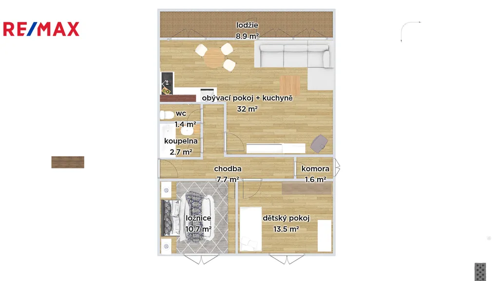 Samotný byt má užitnou plochu 72 m², což poskytuje dostatek prostoru pro pohodlné bydlení. Součástí bytu je také sklep o velikosti 2,5 m², ideální pro uskladnění sezónních věcí a dalších nezbytností. V obytných prostorách najdete částečné vybavení, což vám umožní vytvořit si domov podle vlastních představ. Byt se skládá z kuchyně o velikosti 8,30 m2,obývacího pokoje o velikosti 24 m2, ložnice o velikosti 10,6 m2, dětského pokoje o velikosti 14 m2, koupelny, WC, komory, předsíně a prostorné zasklené lodžie orientované na západ.