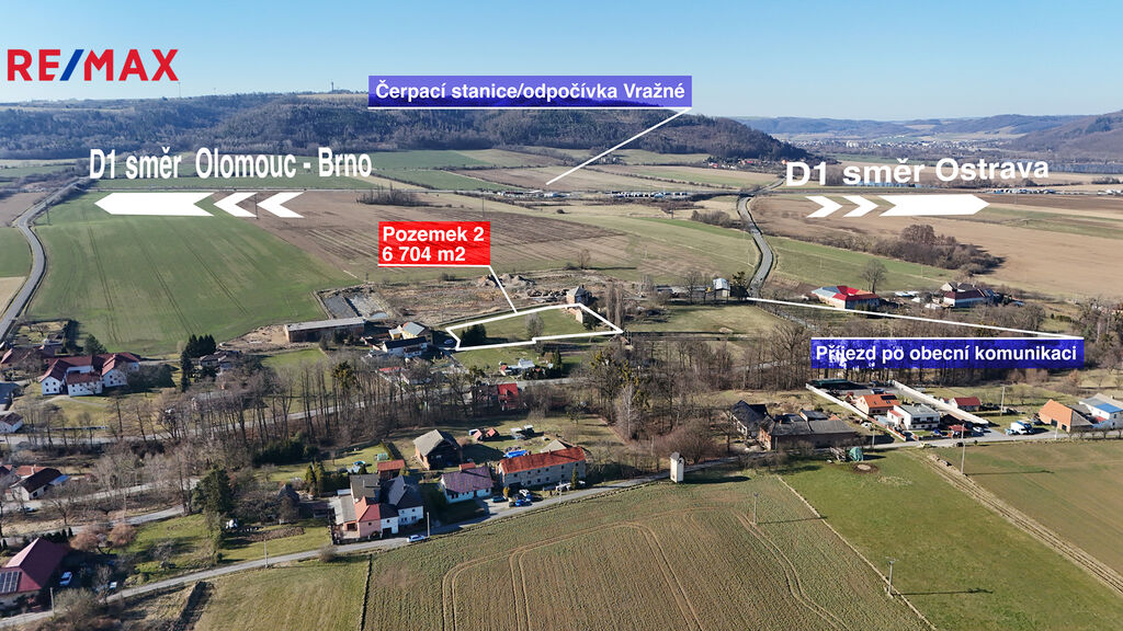 Nabízíme k prodeji pozemek o celkové výměře cca 6 704 m2 pracovně označený ,,POZEMEK 2" v obci Vražné - Hynčice, který vznikne dělením  v případě zajištění dvou zájemců o koupi ,,POZEMEK 1" a ,,POZEMEK 2". Přístup k pozemkům je zajištěn po obecní komunikaci. Pozemky jsou dle platného ÚP vedeny z části v ploše "VL"- VÝROBA A SKLADOVÁNÍ – LEHKÝ PRŮMYSL (cca 6 245 m2) a z části v ploše "ZV" - PLOCHY VEŘEJNÝCH PROSTRANSTVÍ – VEŘEJNÁ ZELEŇ (aktuálně cca 7 162 m2). Soubor pozemků je možné rozdělit, dle návrhu ze zákresu v inzerátu označené ,,POZEMEK 1" o výměře cca 6 703 m2 a POZEMEK 2" o výměře cca 6 704 m2. Na pozemcích označených ,,Prodáno" se již pracuje.