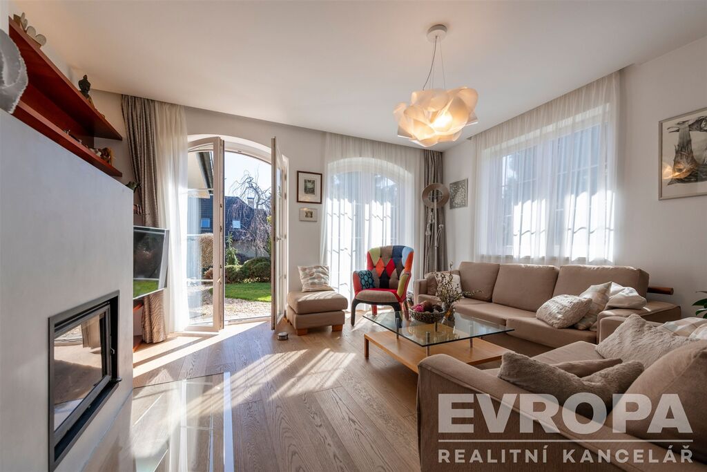 • Velkorysý obývací pokoj s krbem a přímým vstupem na krytou terasu (30 m²) – ideální pro letní snídaně i večerní víno