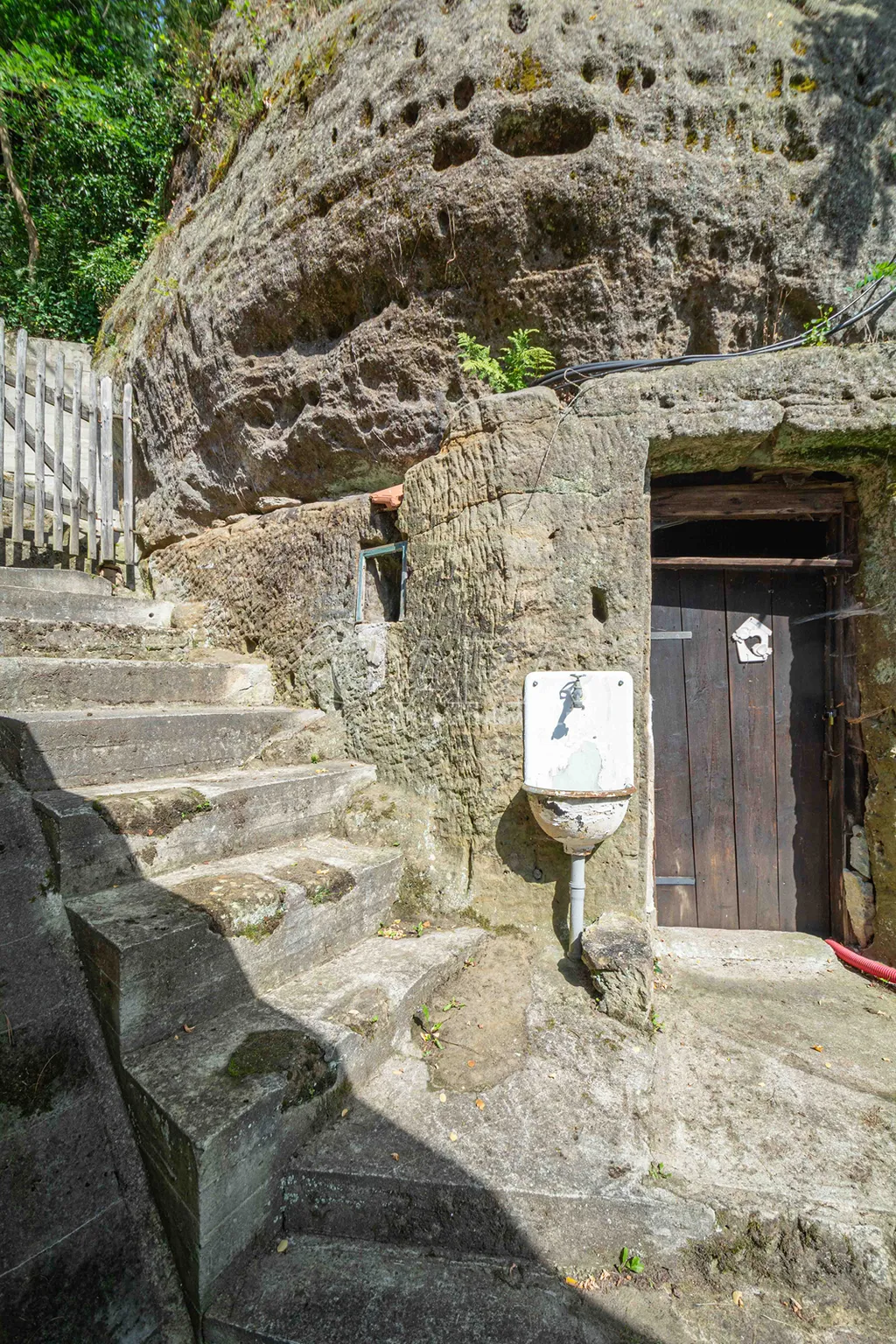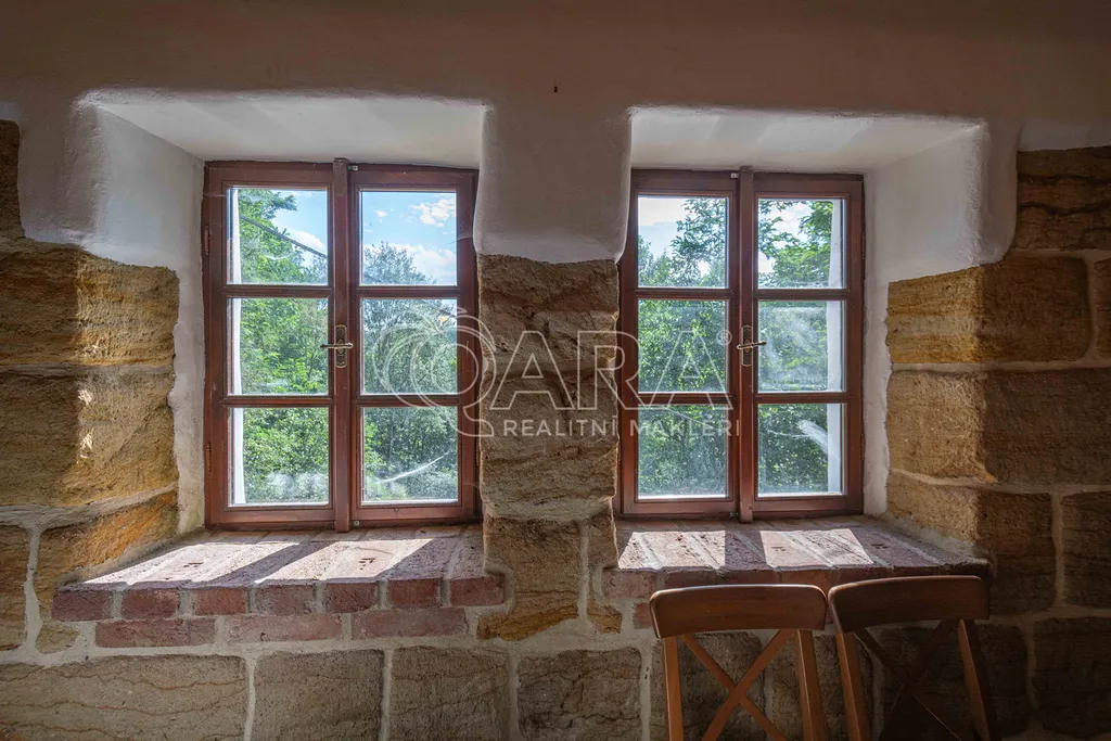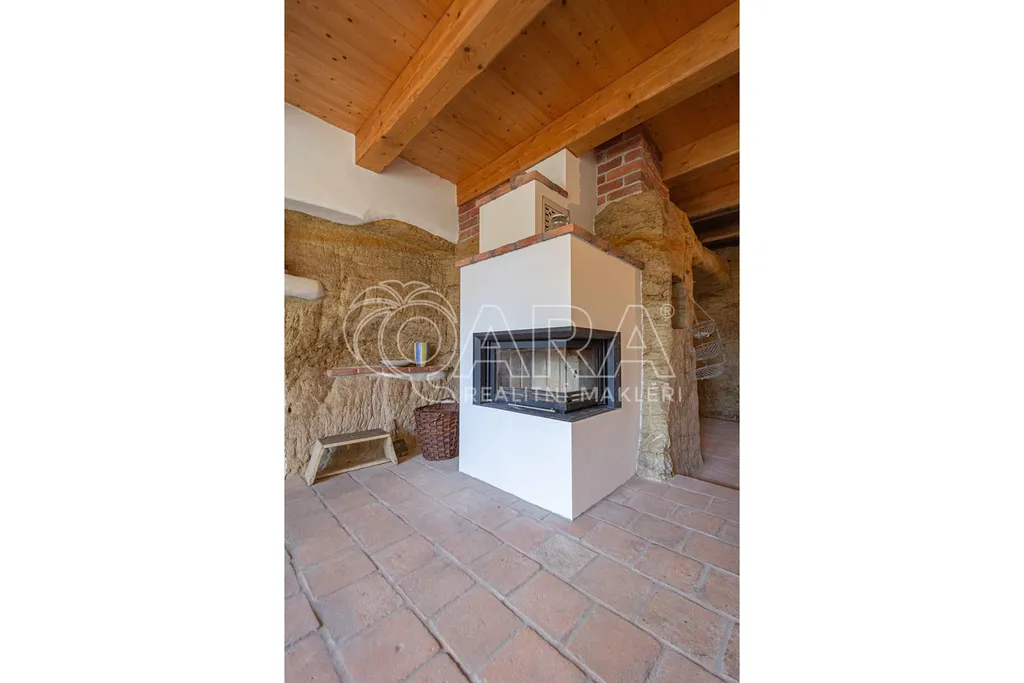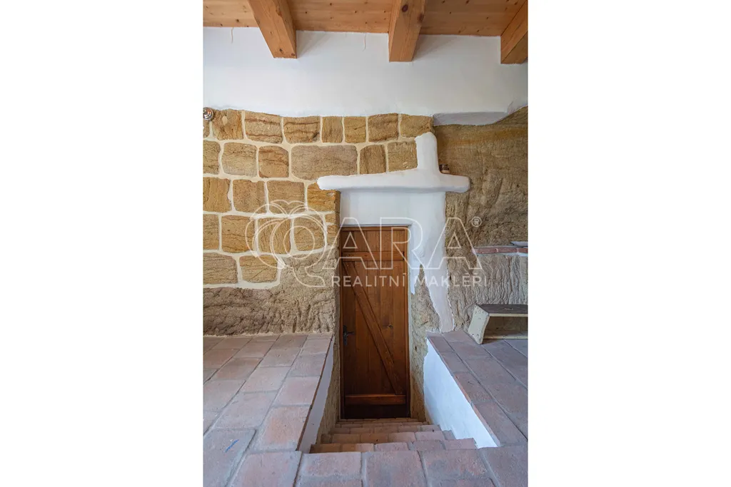 Dispozice: vstupní chodba ze které je vstup do skalního sklepa, koupelna se sprchovým koutem a WC zapuštěným ve skále, obývací pokoj s krbem, kuchyně taktéž zapuštěná do skály, pokoj v suterénu a otevřené horní patro, sloužící jako ložnice. Venku technická místnost s motorovým proudem, dílna a další sklep, vše zapuštěné ve skále s vlastním vchodem.